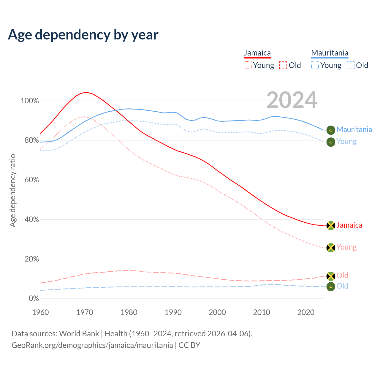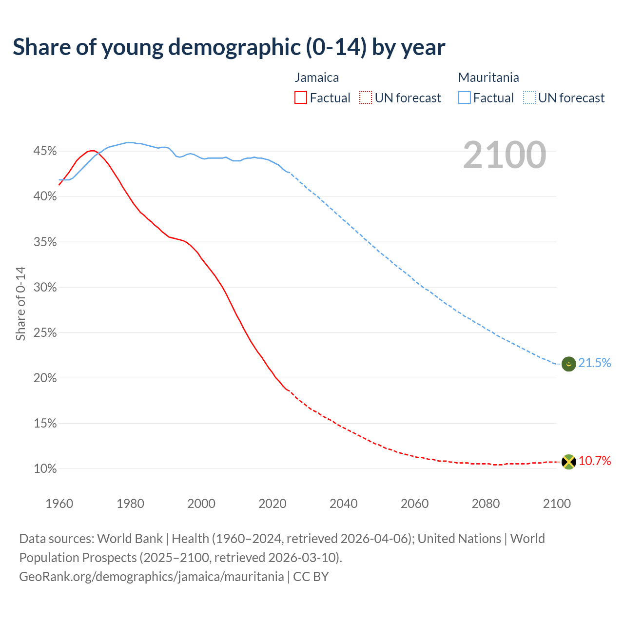 - The share of young demographic (0-15 years old) in Jamaica is 18.7% vs 42.7% in Mauritania.