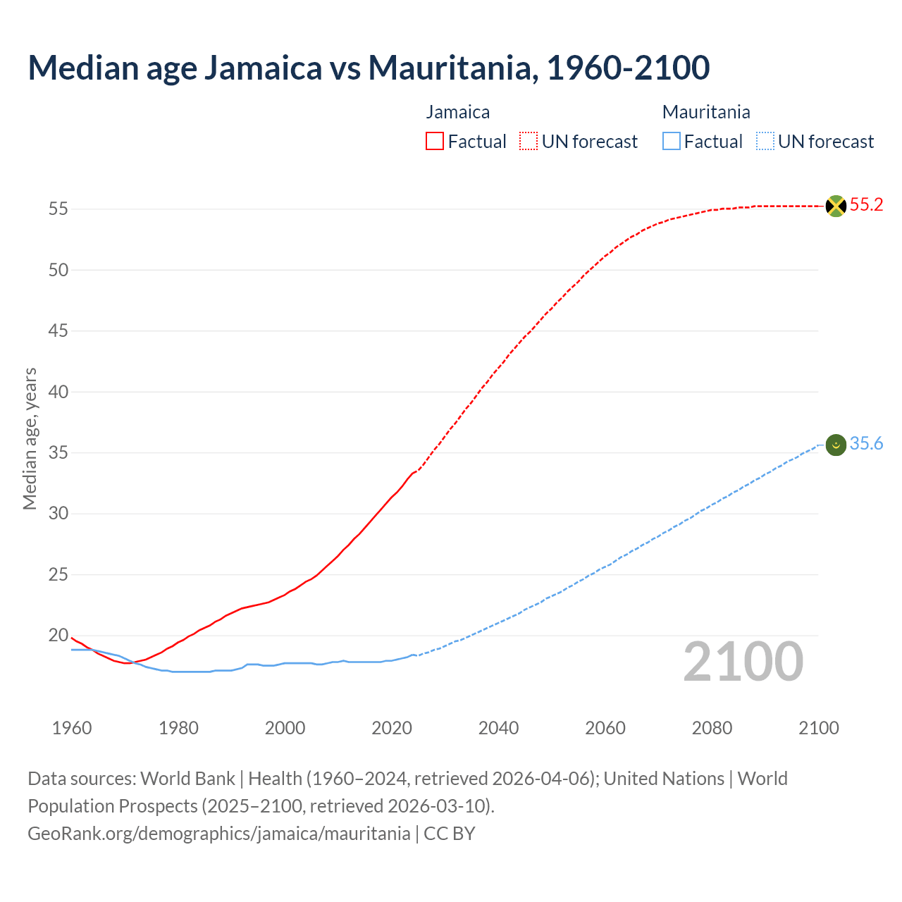 - Jamaica is ranked 87/196 by median age (oldest to youngest) vs 185/196 for Mauritania.