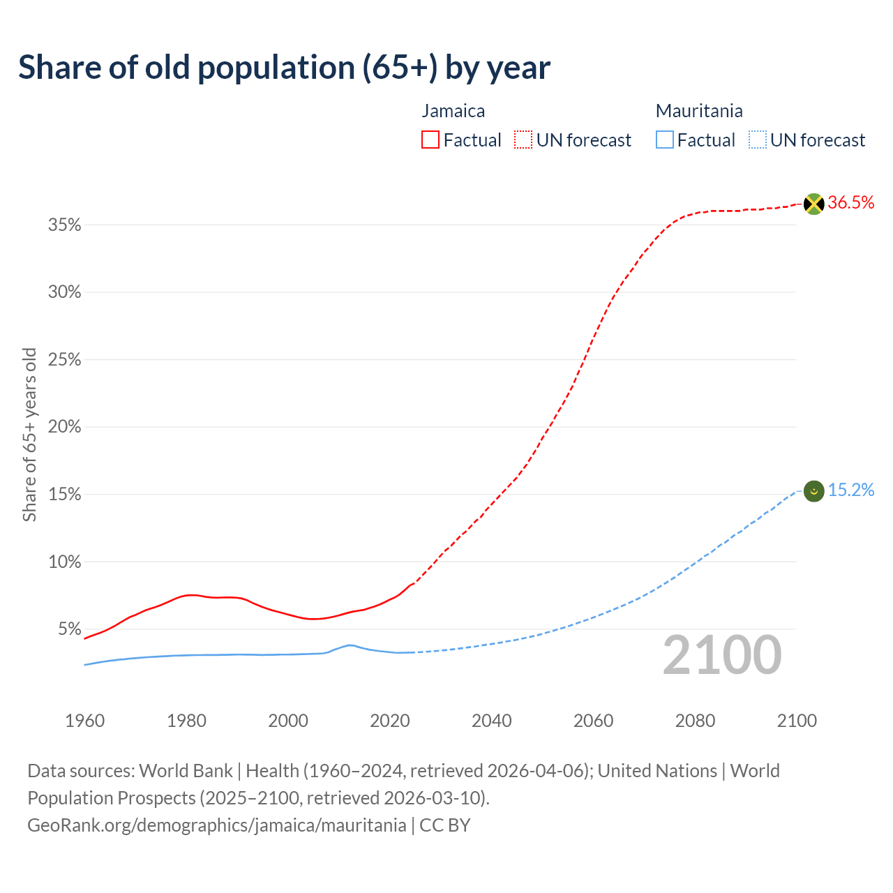 The share of older people aged 65 and over is 8.21% in Jamaica and 3.23% in Mauritania. Life expectancy in Jamaica compared to Mauritania .