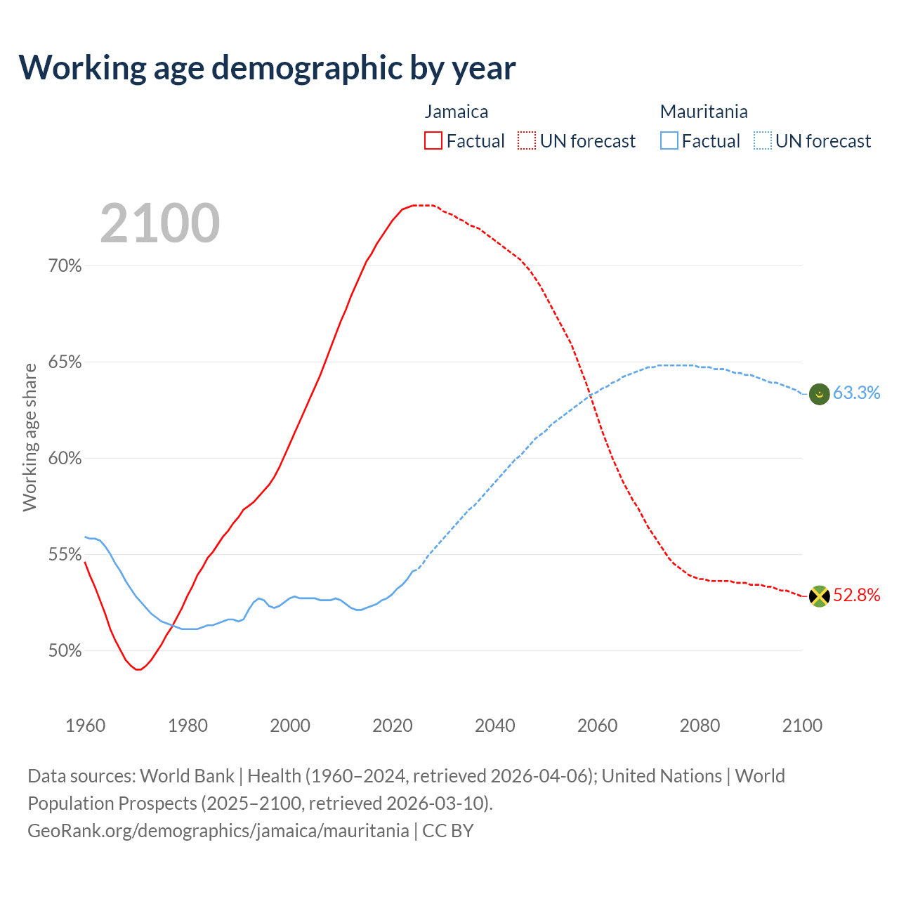 - Jamaica has 2.07M working age adults (aged 15-64) vs 2.98M in Mauritania.