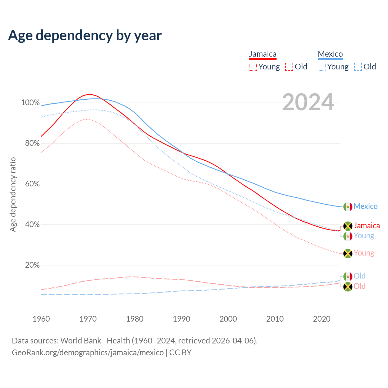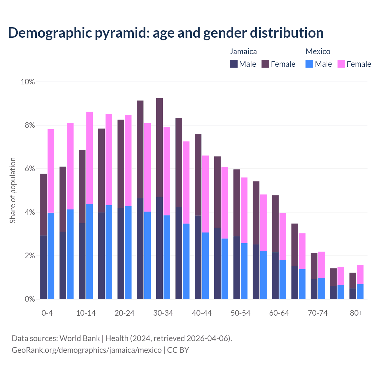 - Jamaica is ranked 87/196 by median age (oldest to youngest) vs 102/196 for Mexico.