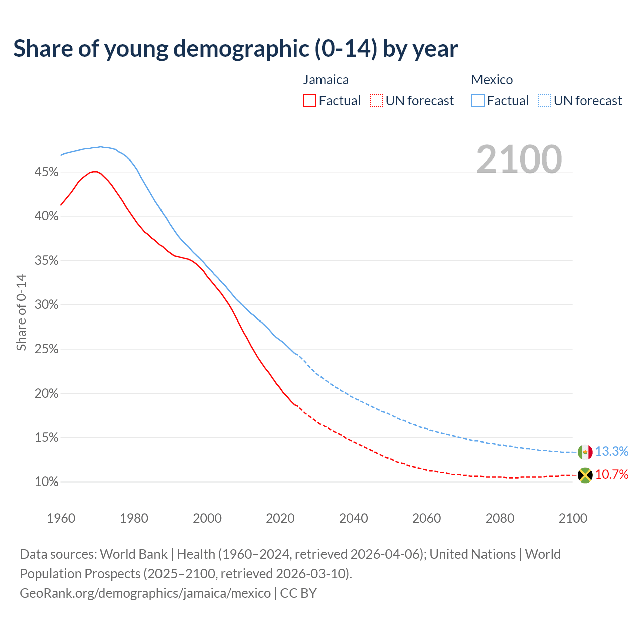 - The share of young demographic (0-15 years old) in Jamaica is 18.7% vs 24.5% in Mexico.