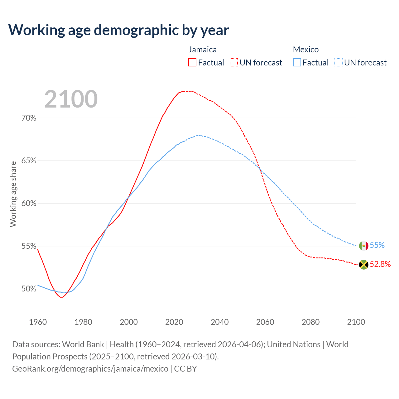 - Jamaica has 2.07M working age adults (aged 15-64) vs 89.6M in Mexico.