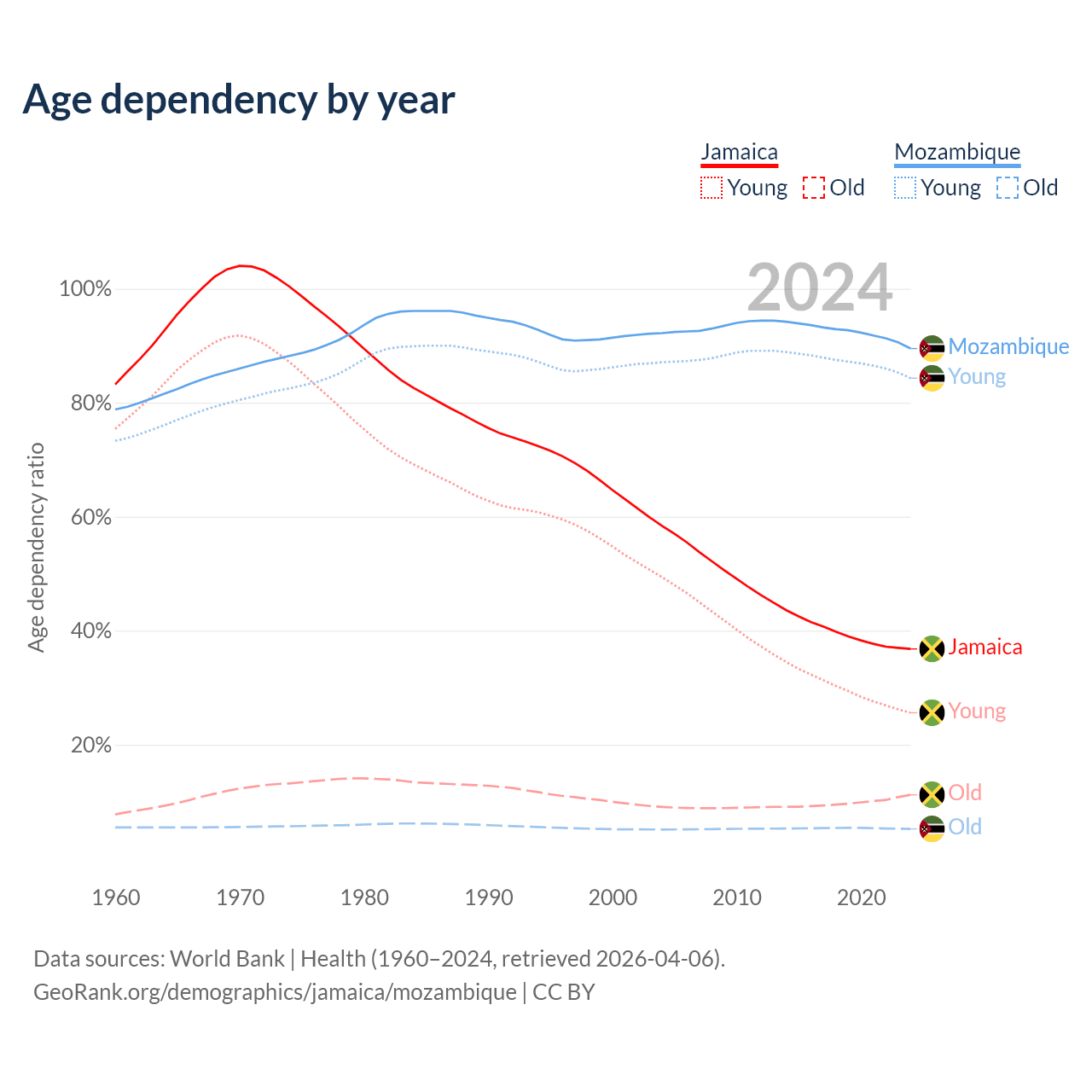 - Jamaica is ranked 87/196 by median age (oldest to youngest) vs 189/196 for Mozambique.