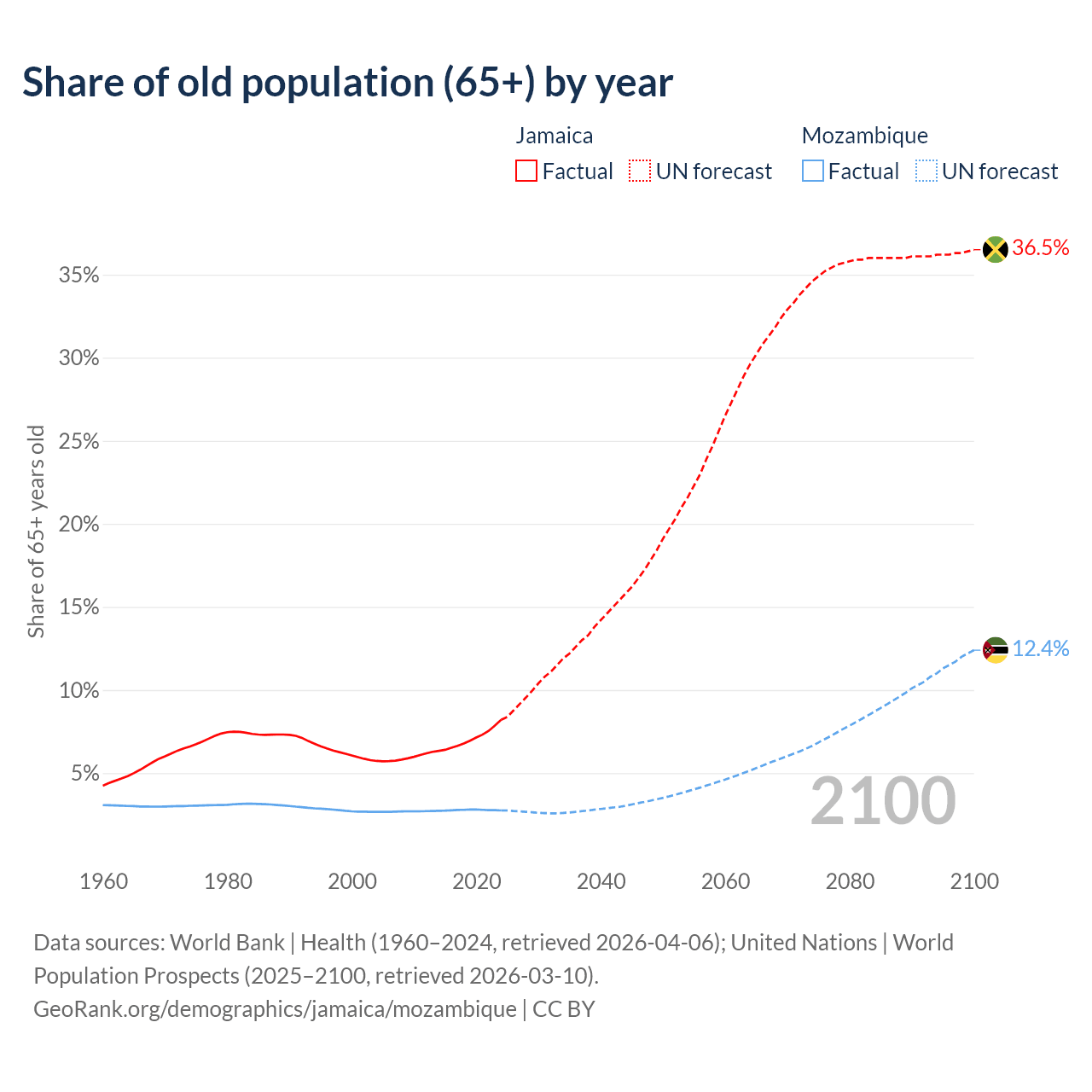 - The share of old-age demographic (65+) in Jamaica is 8.21% vs 2.75% in Mozambique.