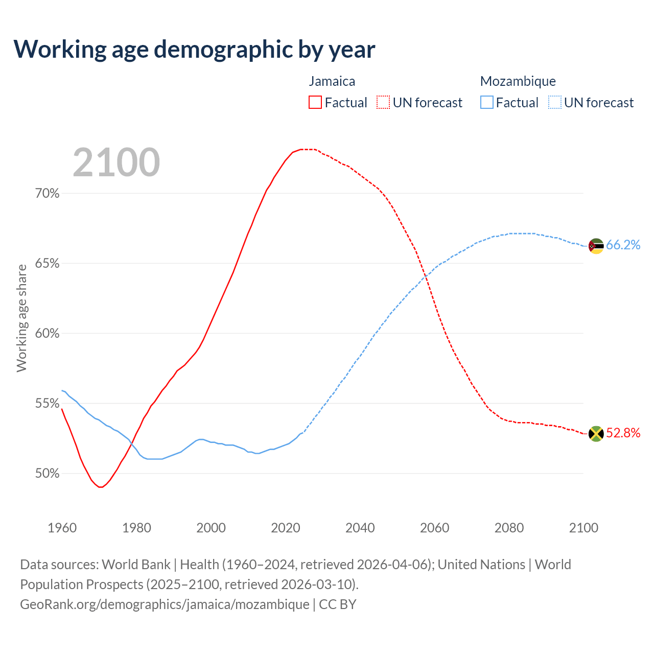 - Jamaica has 2.07M working age adults (aged 15-64) vs 19.5M in Mozambique.