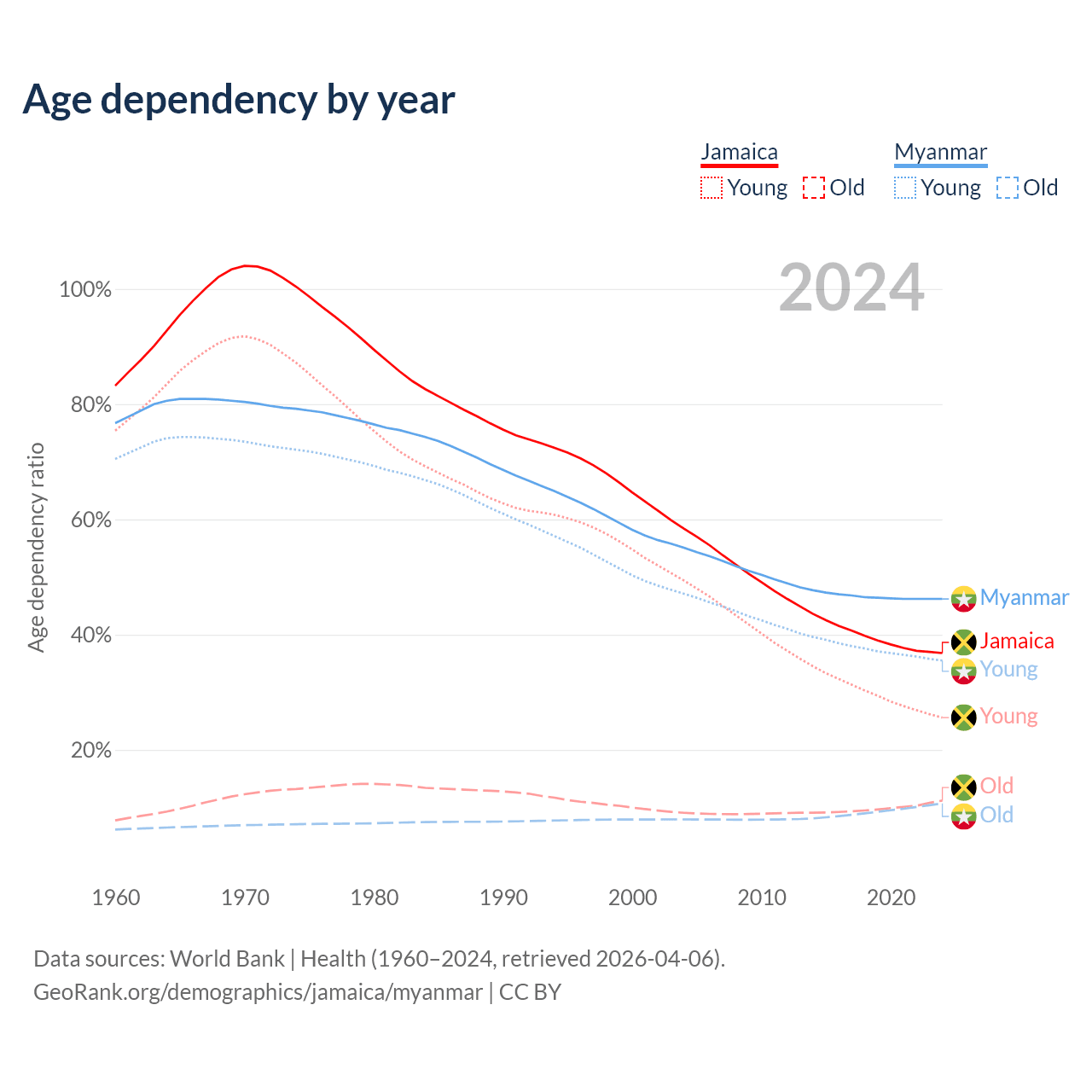 The share of older people aged 65 and over is 8.21% in Jamaica and 7.3% in Myanmar. Life expectancy in Jamaica compared to Myanmar .