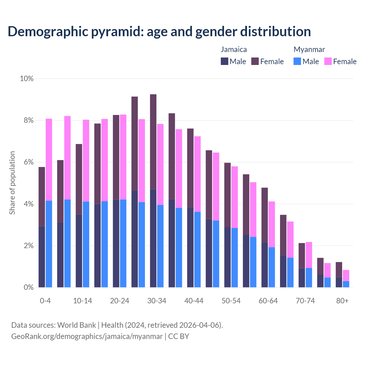 - Jamaica is ranked 87/196 by median age (oldest to youngest) vs 96/196 for Myanmar.