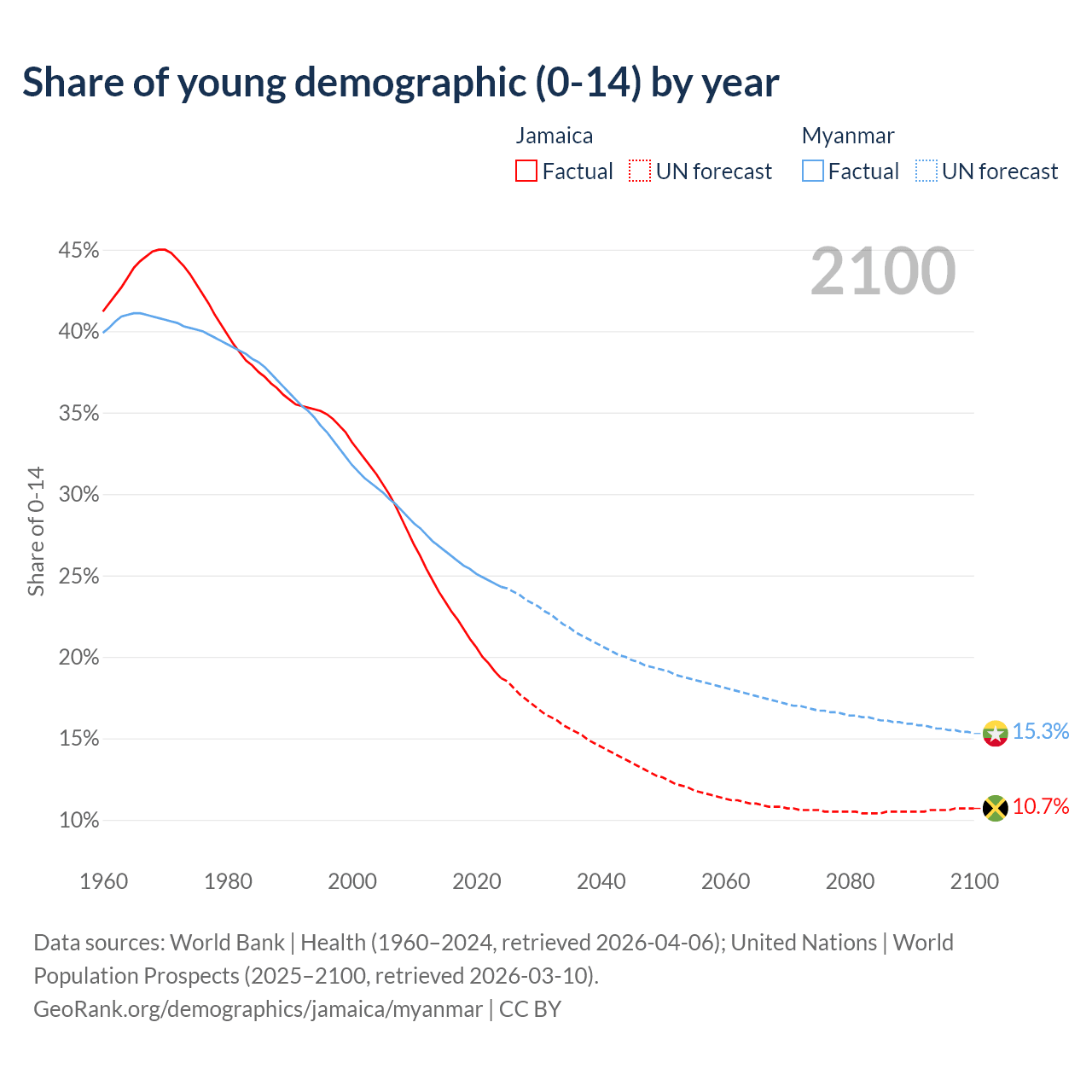 - The share of young demographic (0-15 years old) in Jamaica is 18.7% vs 24.3% in Myanmar.