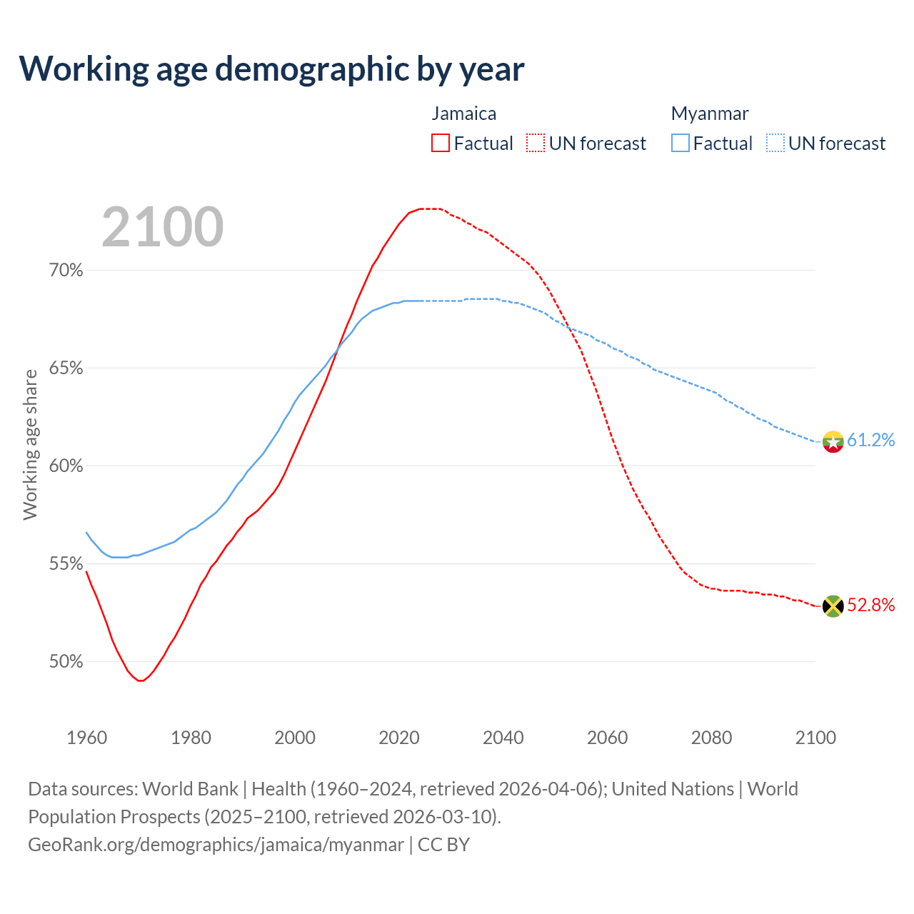 - Jamaica has 2.07M working age adults (aged 15-64) vs 37.8M in Myanmar.