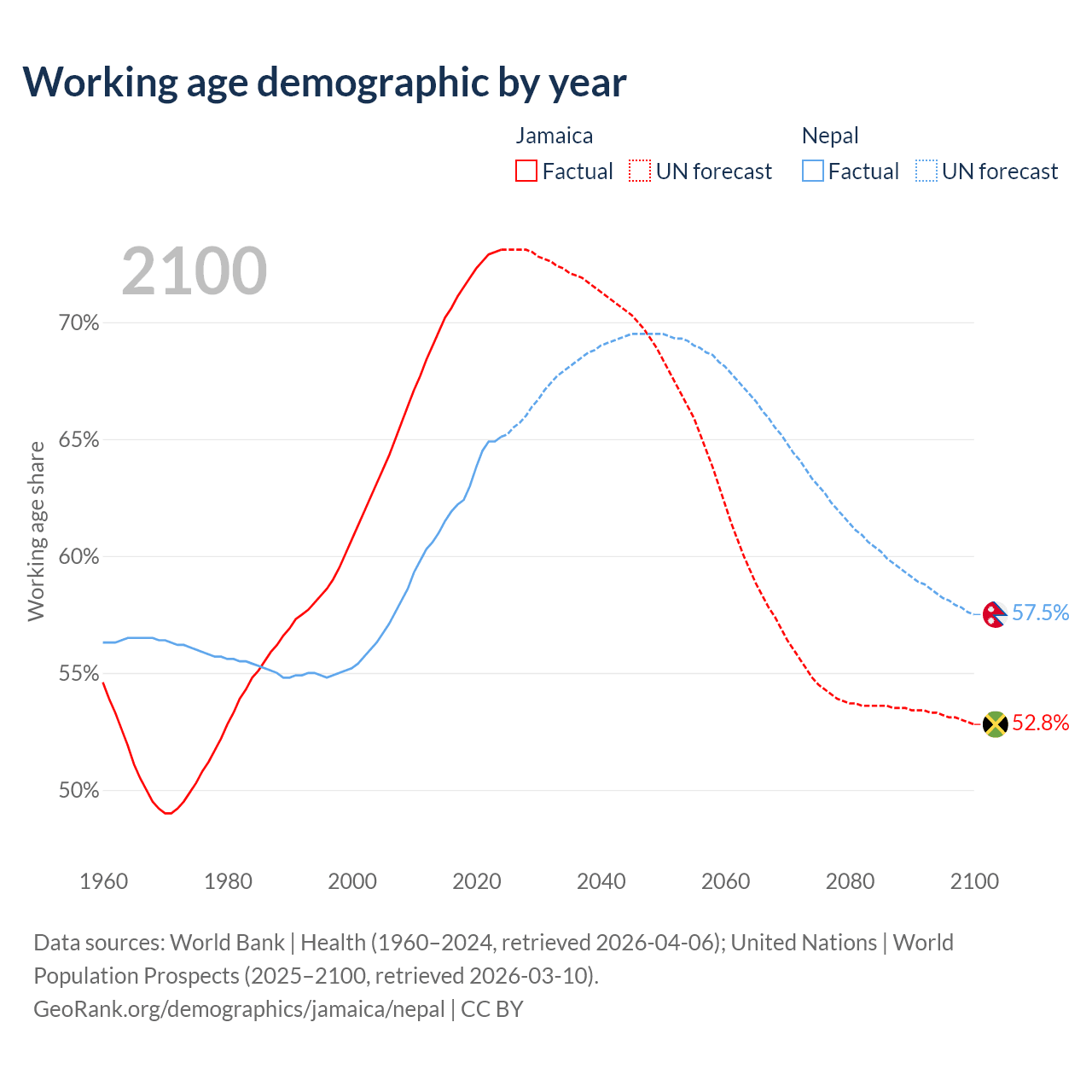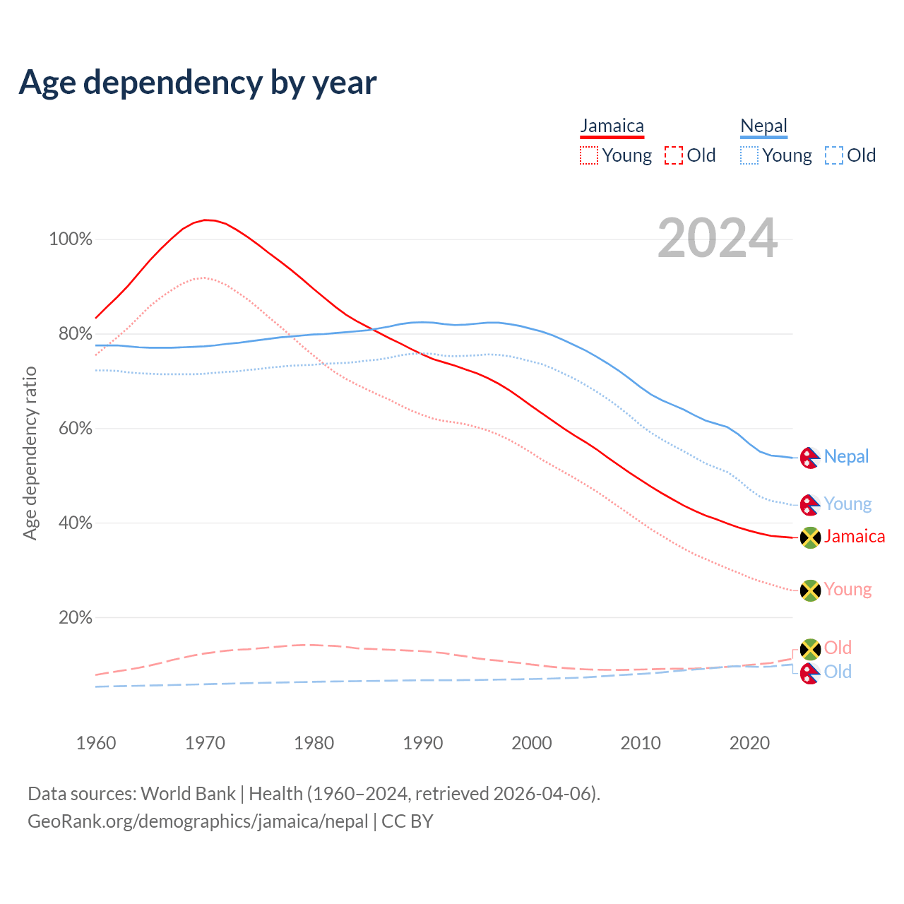 - The share of old-age demographic (65+) in Jamaica is 8.21% vs 6.5% in Nepal.