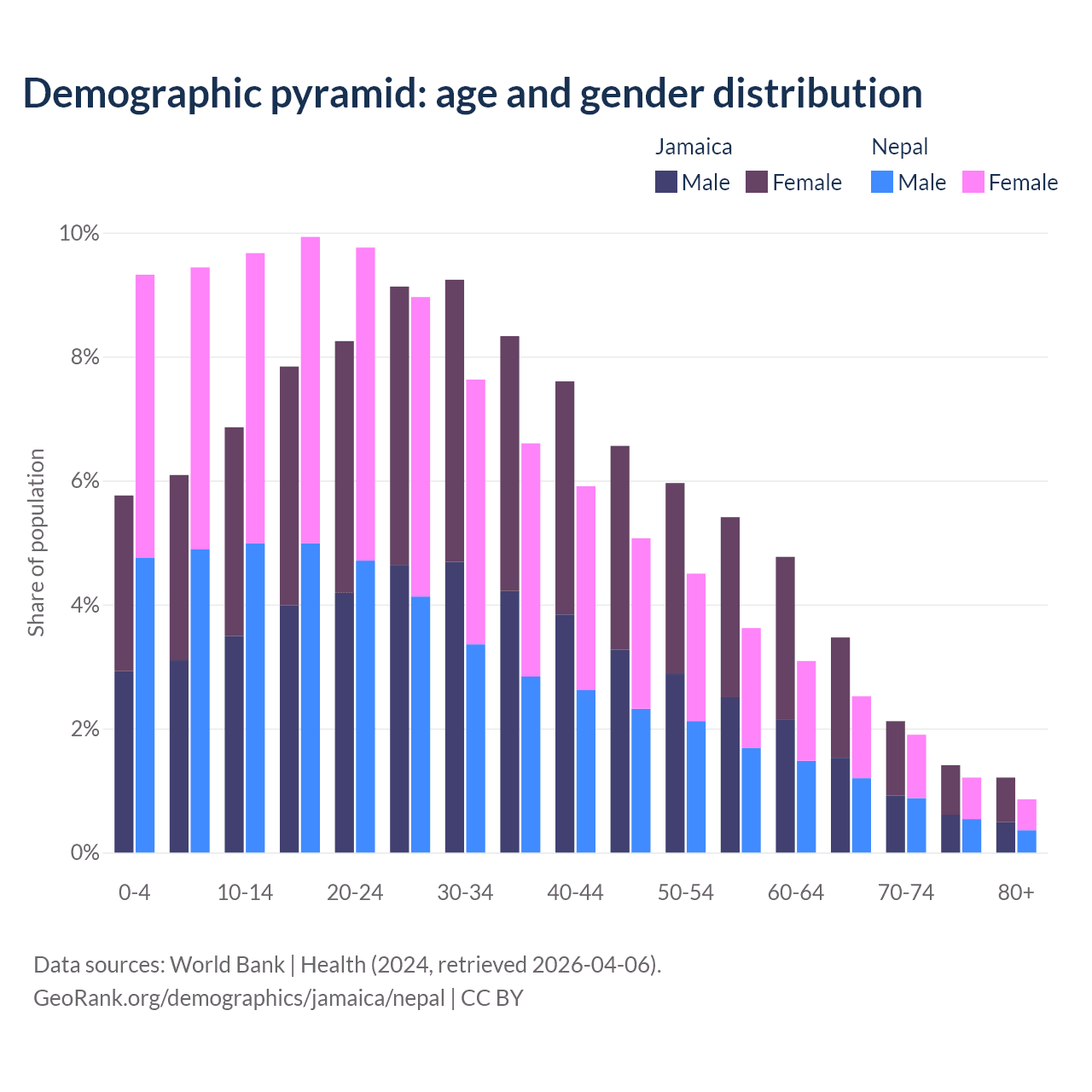 - Jamaica is ranked 87/196 by median age (oldest to youngest) vs 127/196 for Nepal.