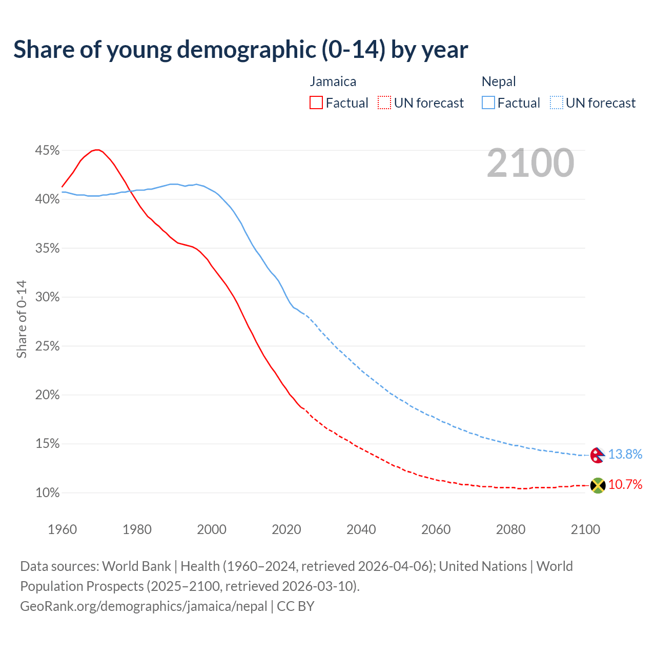 - The share of young demographic (0-15 years old) in Jamaica is 18.7% vs 28.4% in Nepal.