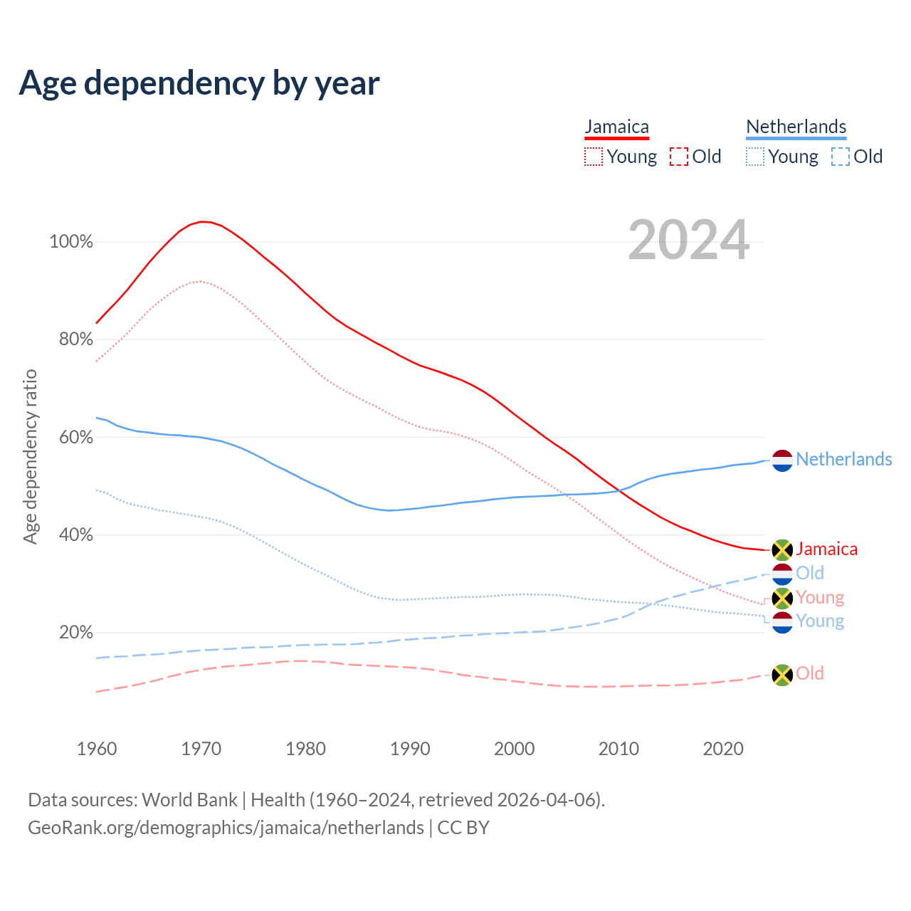 - The share of old-age demographic (65+) in Jamaica is 8.21% vs 20.5% in the Netherlands.