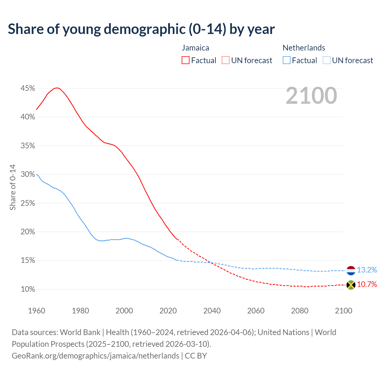 - The share of young demographic (0-15 years old) in Jamaica is 18.7% vs 15% in the Netherlands.