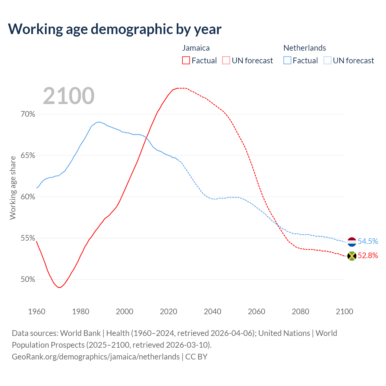 - Jamaica has 2.07M working age adults (aged 15-64) vs 11.8M in the Netherlands.