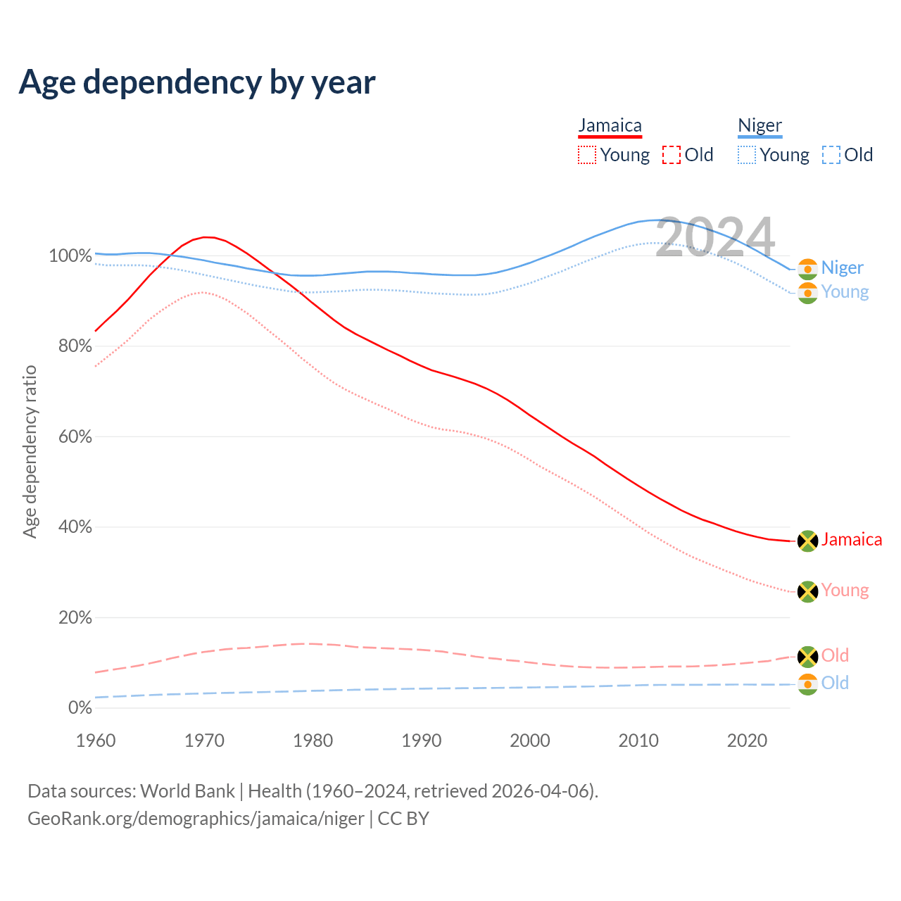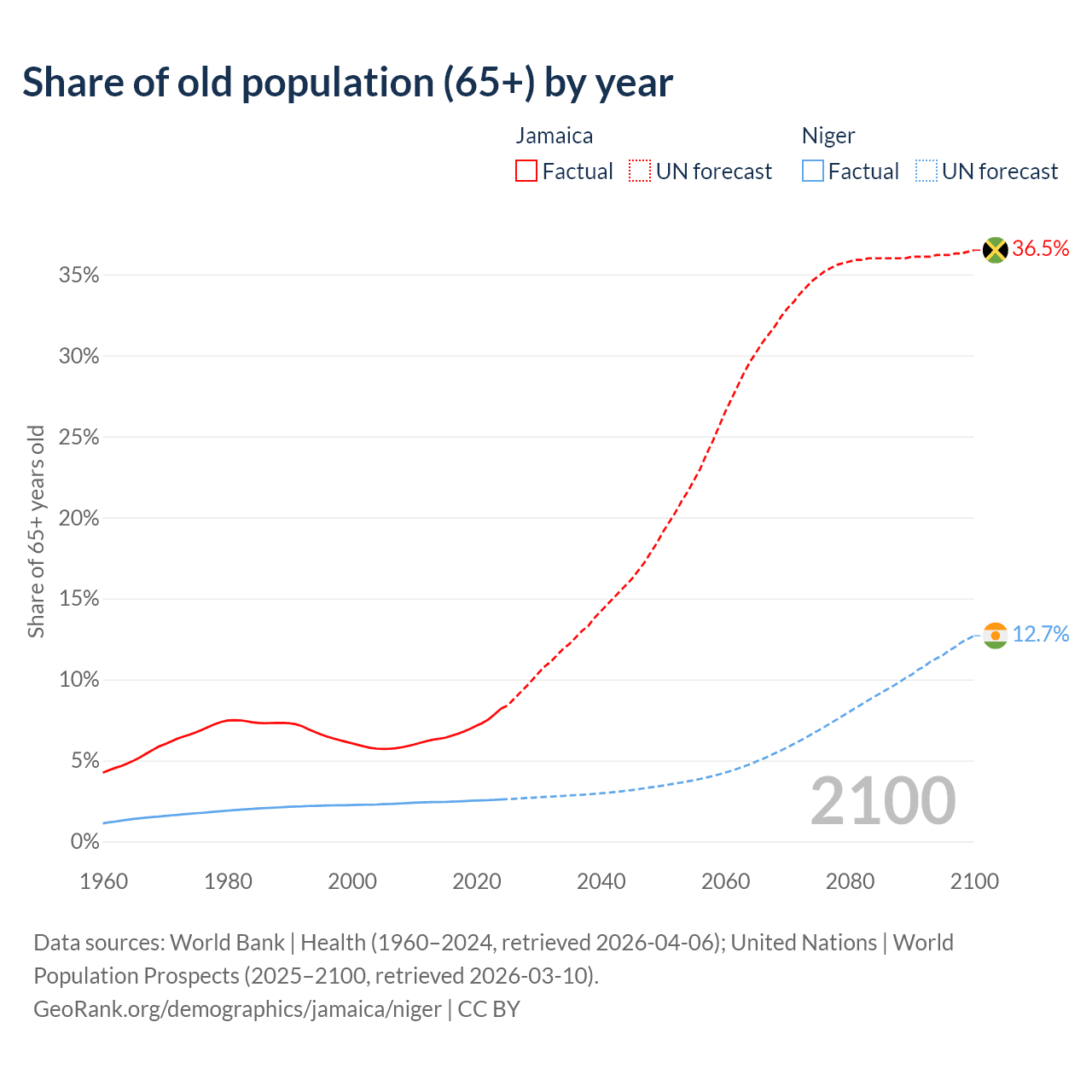 - The share of old-age demographic (65+) in Jamaica is 8.21% vs 2.59% in Niger.