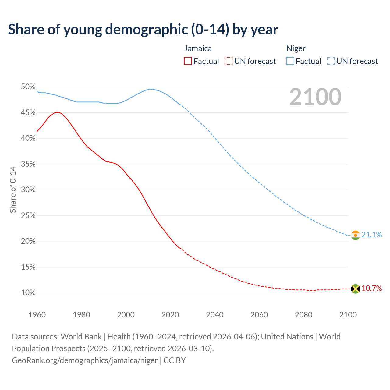 - The share of young demographic (0-15 years old) in Jamaica is 18.7% vs 46.6% in Niger.
