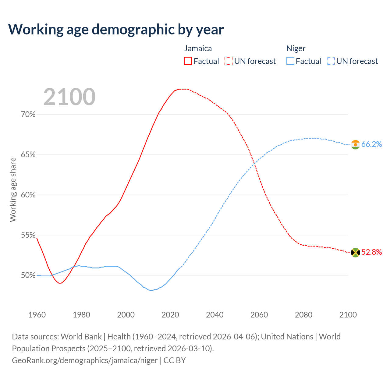 - Jamaica has 2.07M working age adults (aged 15-64) vs 14.8M in Niger.