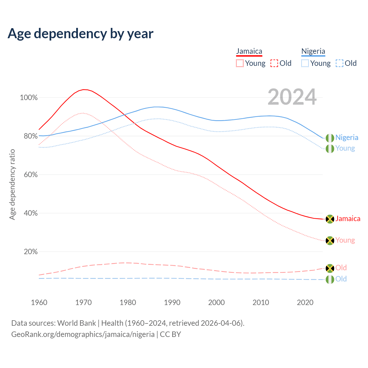 - Jamaica is ranked 87/196 by median age (oldest to youngest) vs 178/196 for Nigeria.