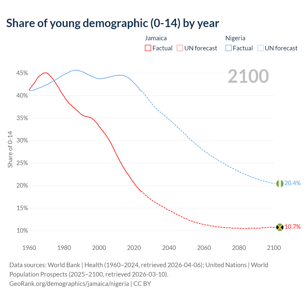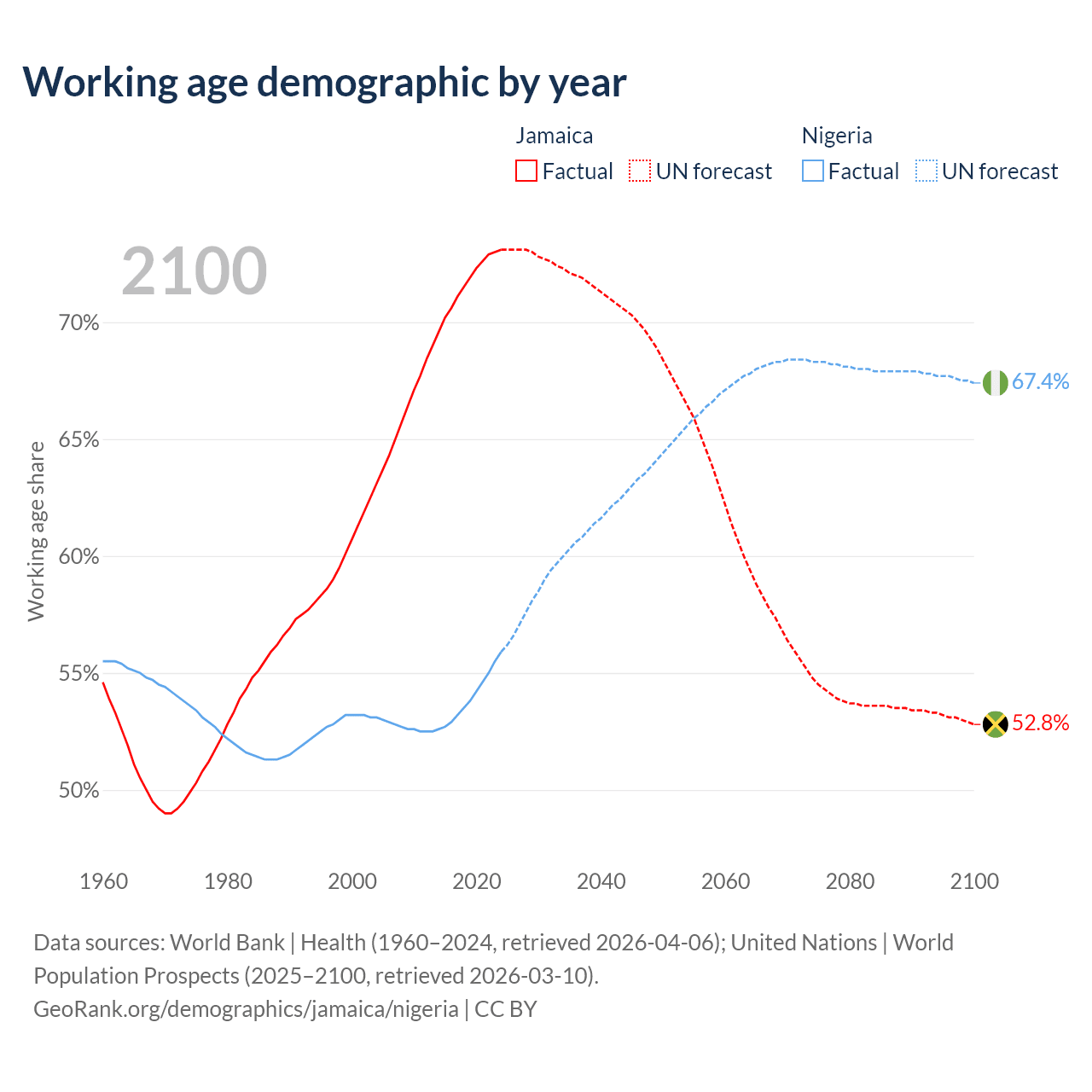 Median age Jamaica vs Nigeria, 1960-2100