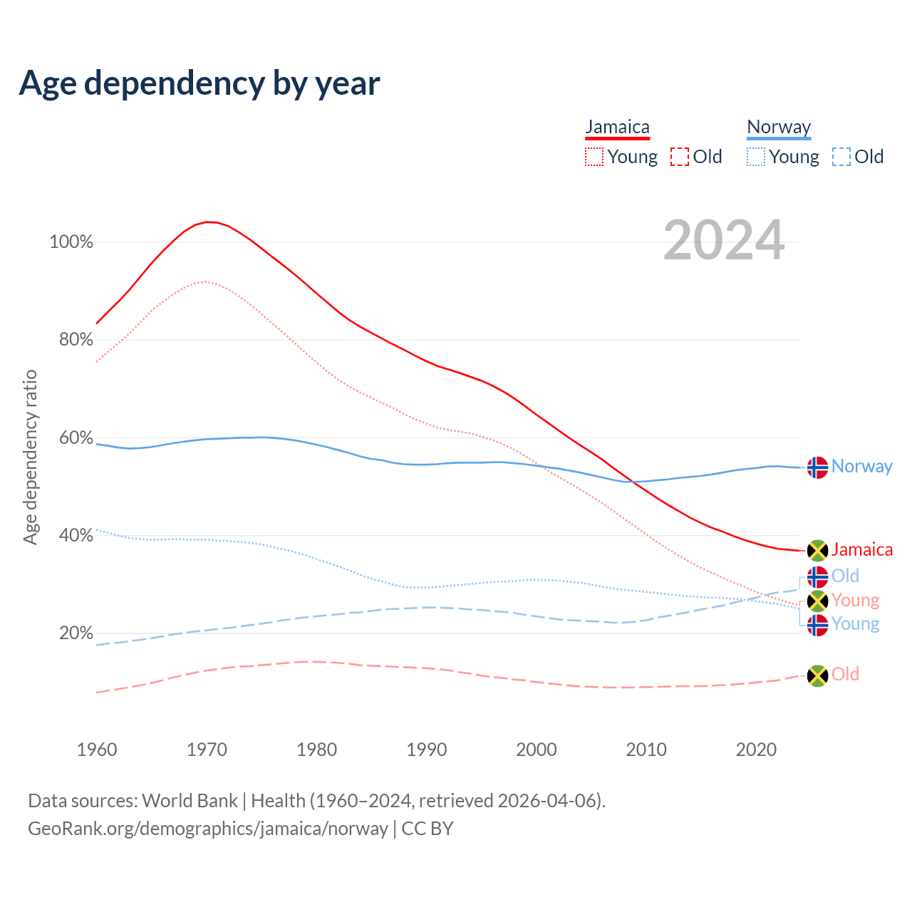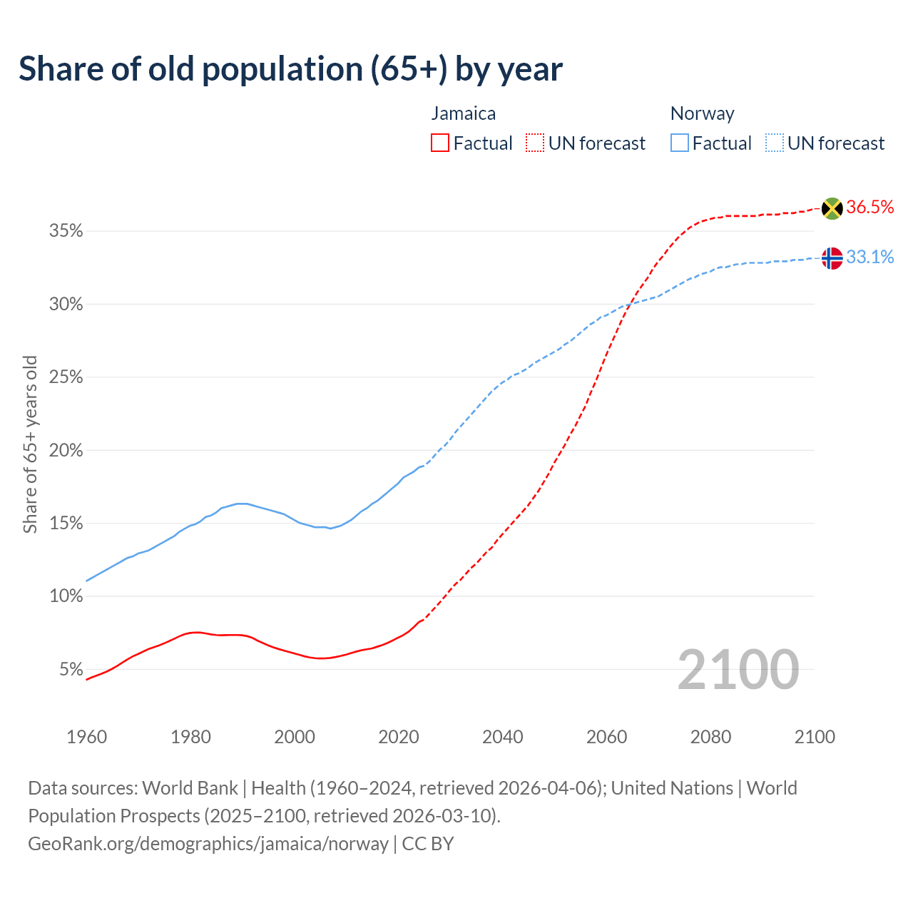 - The share of old-age demographic (65+) in Jamaica is 8.21% vs 18.8% in Norway.