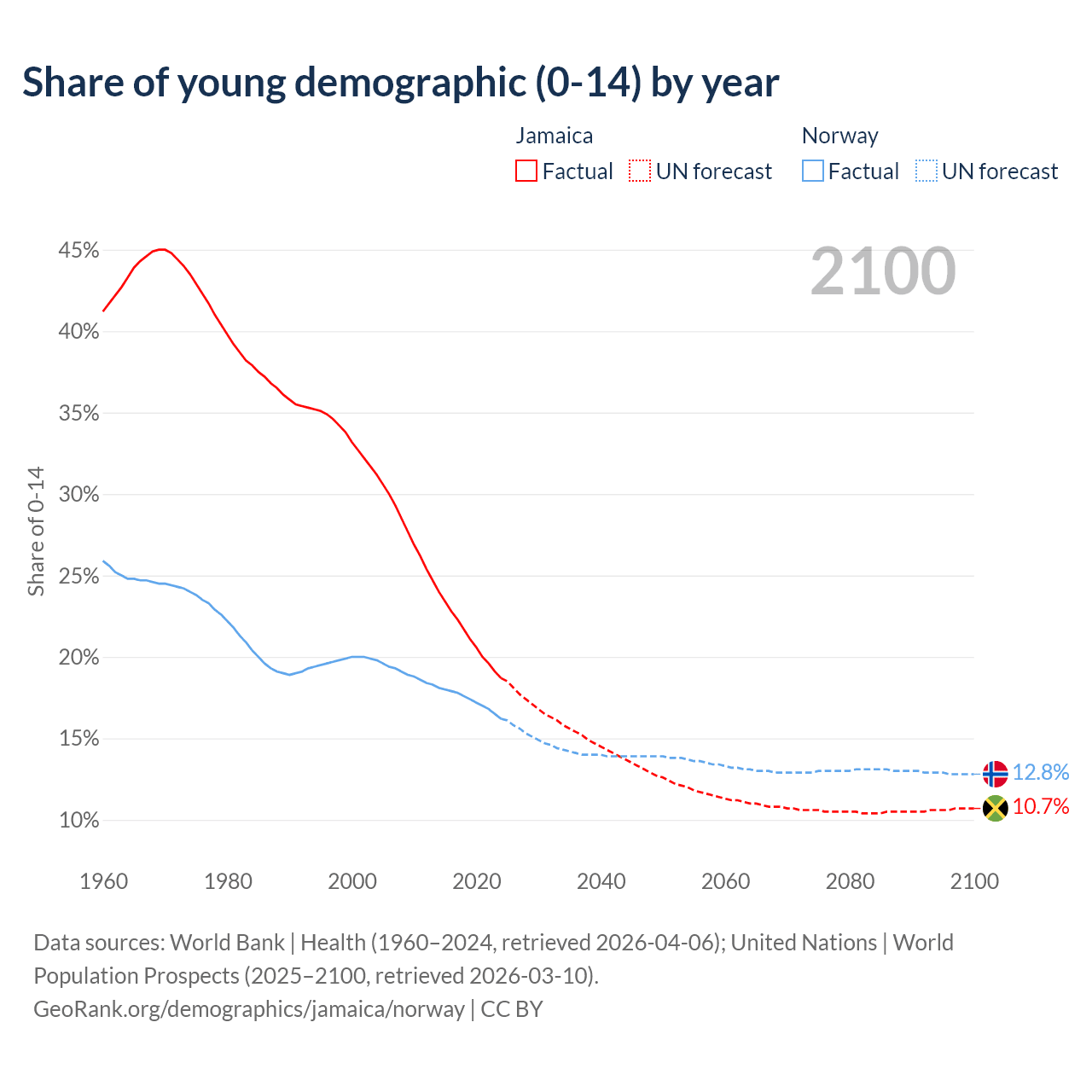 - The share of young demographic (0-15 years old) in Jamaica is 18.7% vs 16.2% in Norway.