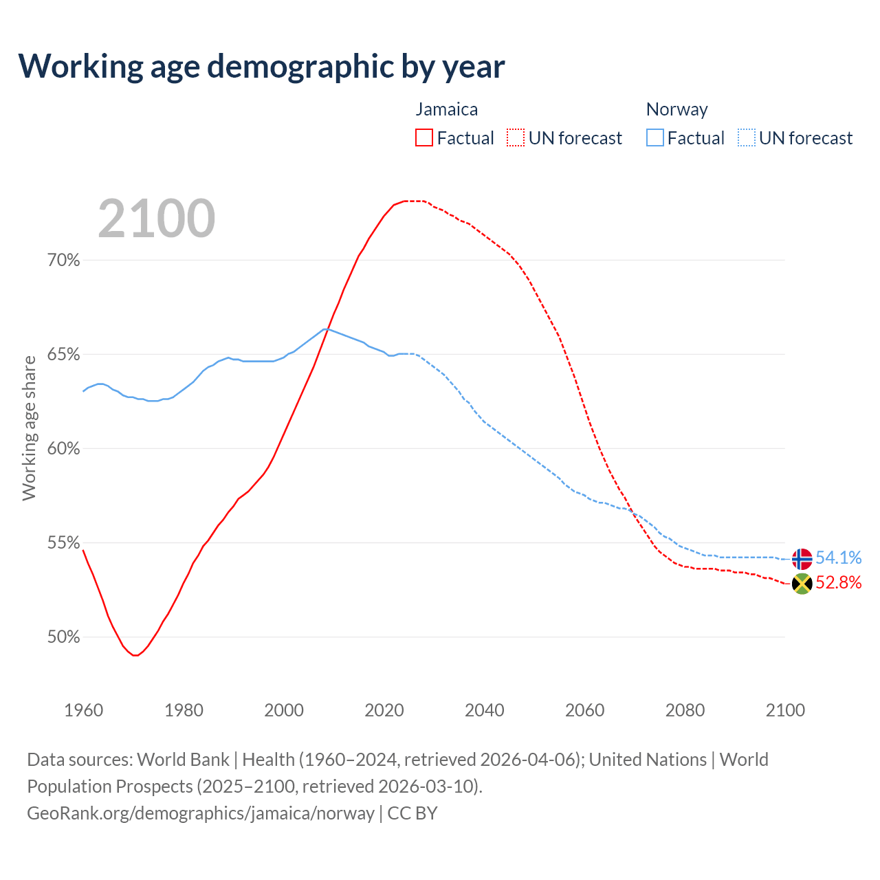 - Jamaica has 2.07M working age adults (aged 15-64) vs 3.69M in Norway.
