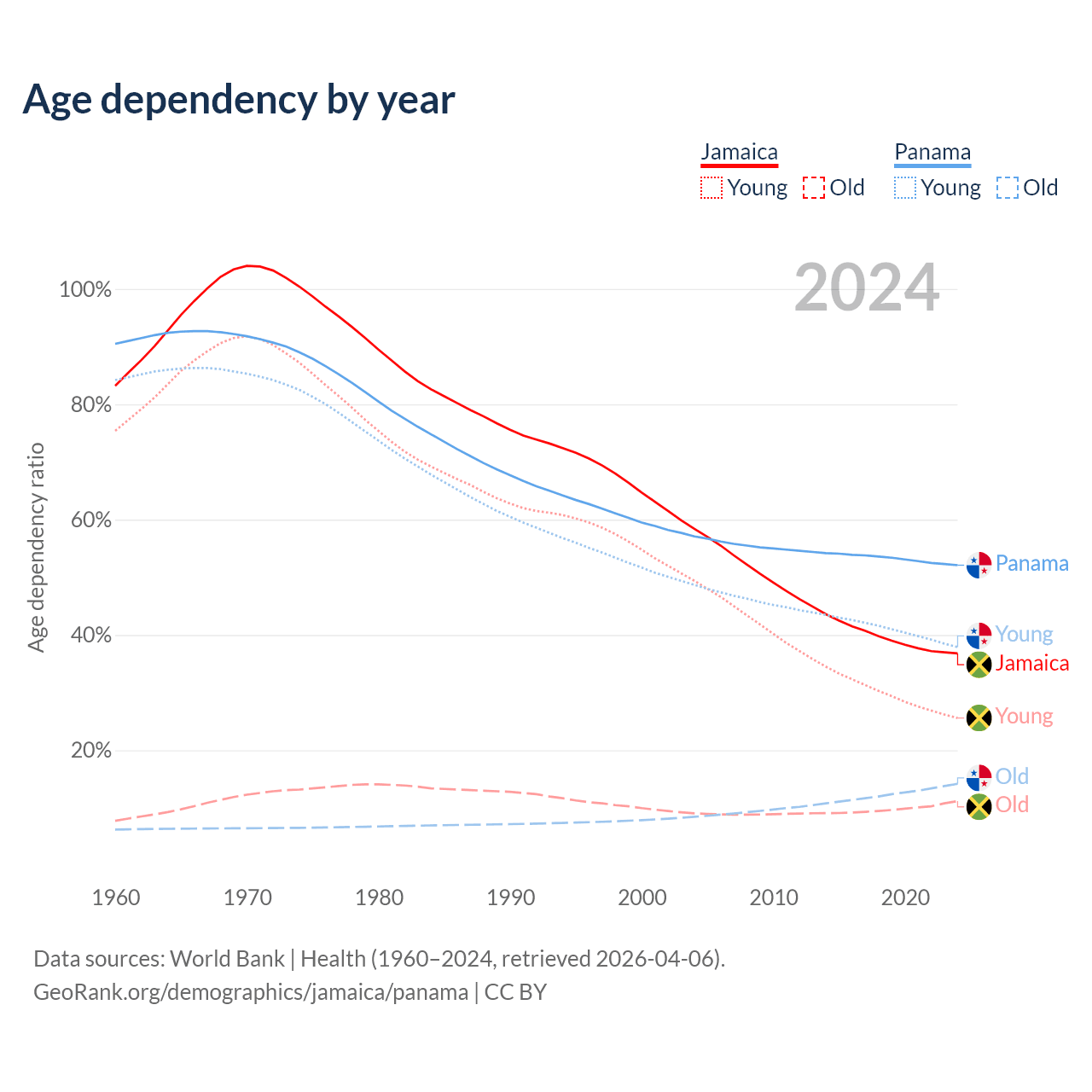 - Jamaica is ranked 87/196 by median age (oldest to youngest) vs 94/196 for Panama.