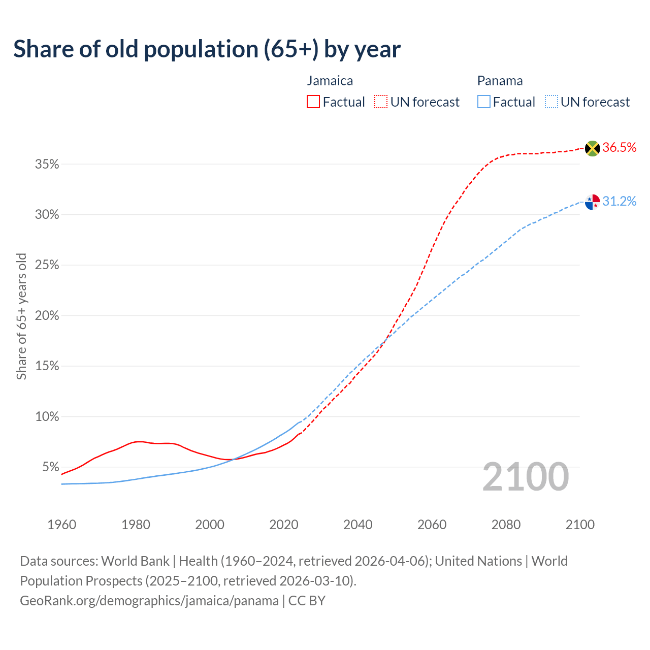 The share of older people aged 65 and over is 8.21% in Jamaica and 9.35% in Panama. Life expectancy in Jamaica compared to Panama .