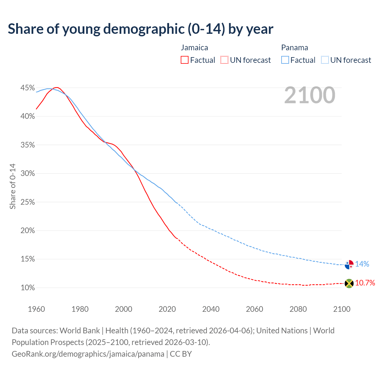 - The share of young demographic (0-15 years old) in Jamaica is 18.7% vs 24.9% in Panama.