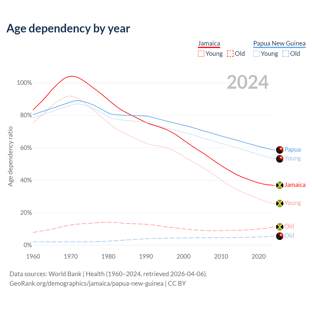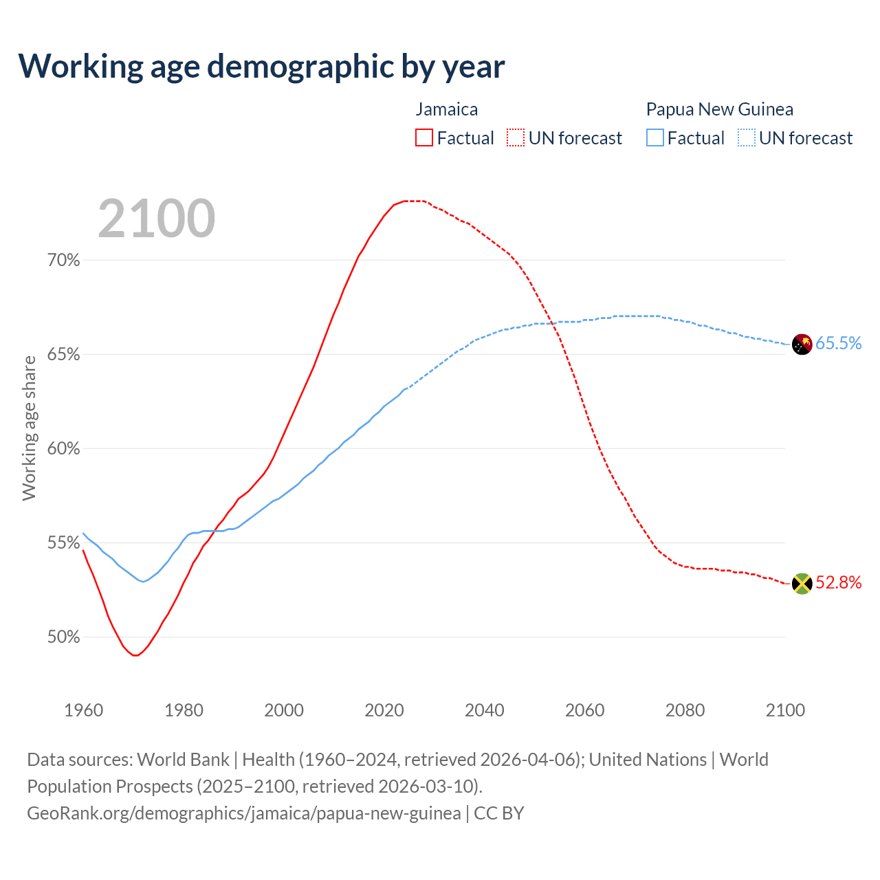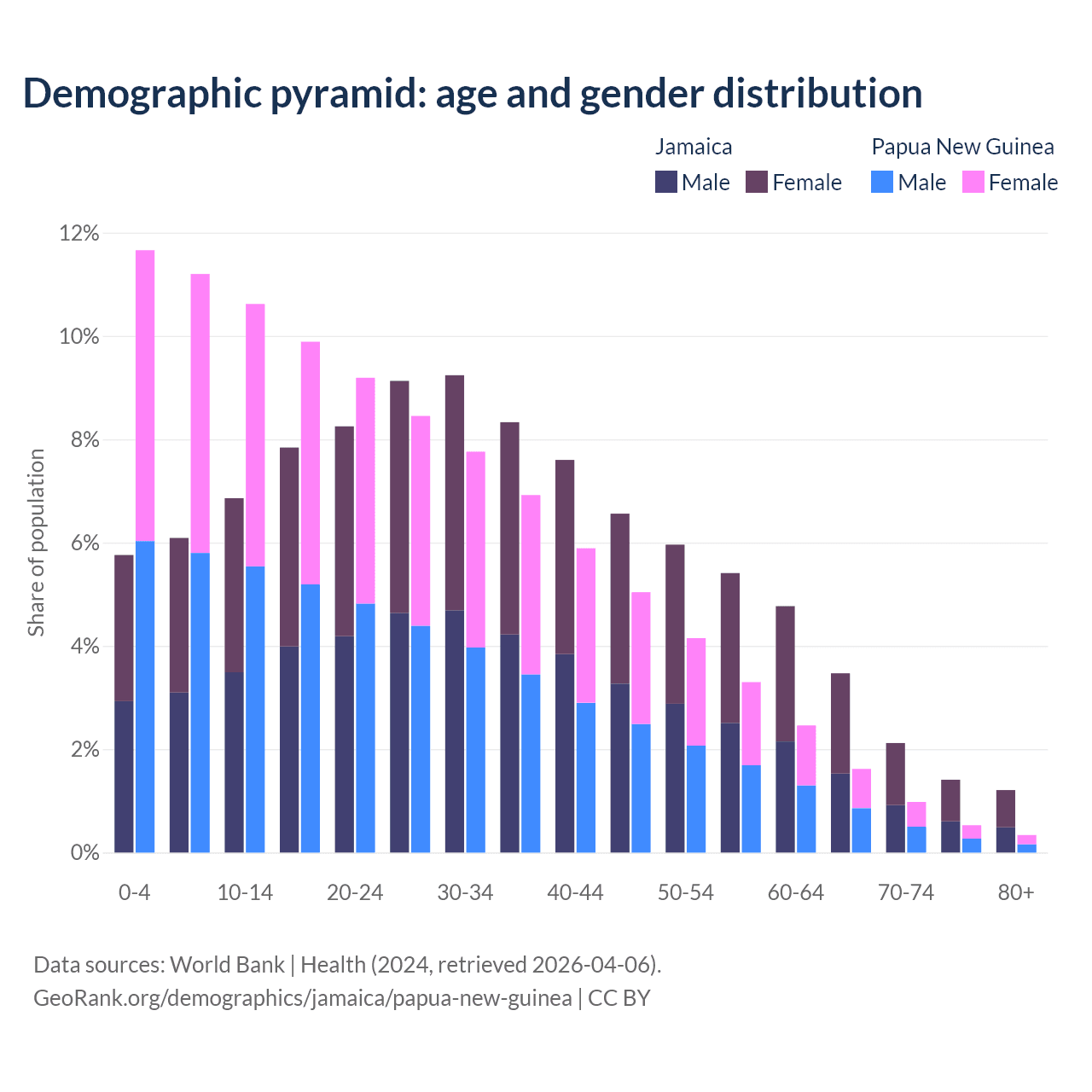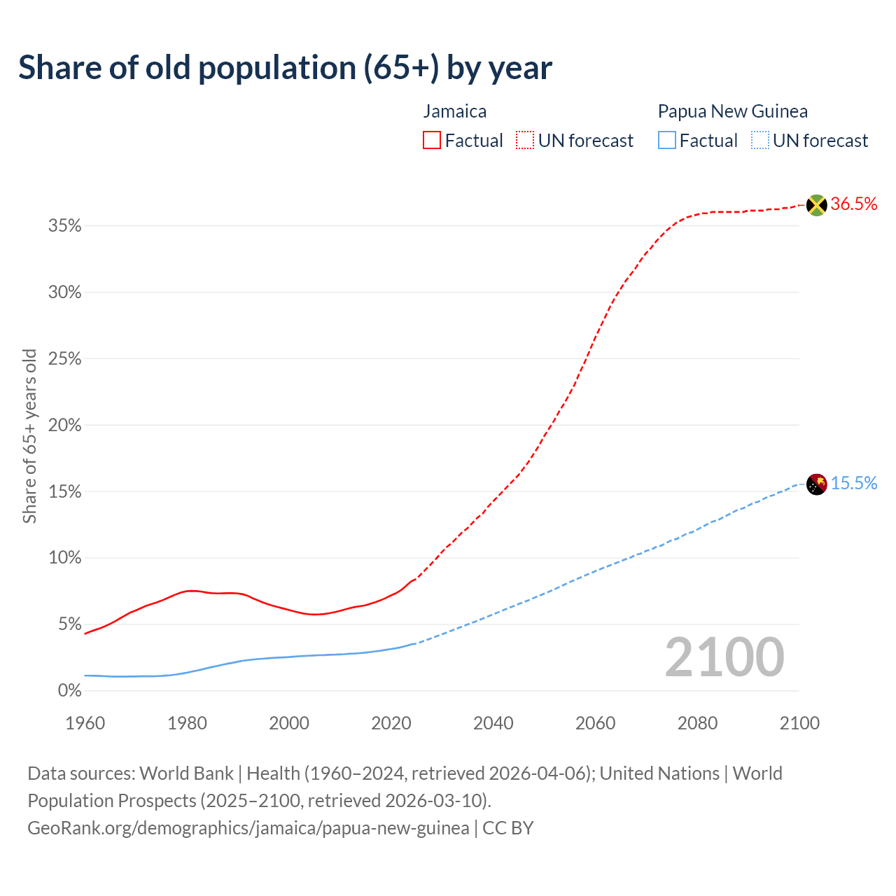 - The share of old-age demographic (65+) in Jamaica is 8.21% vs 3.46% in Papua New Guinea.