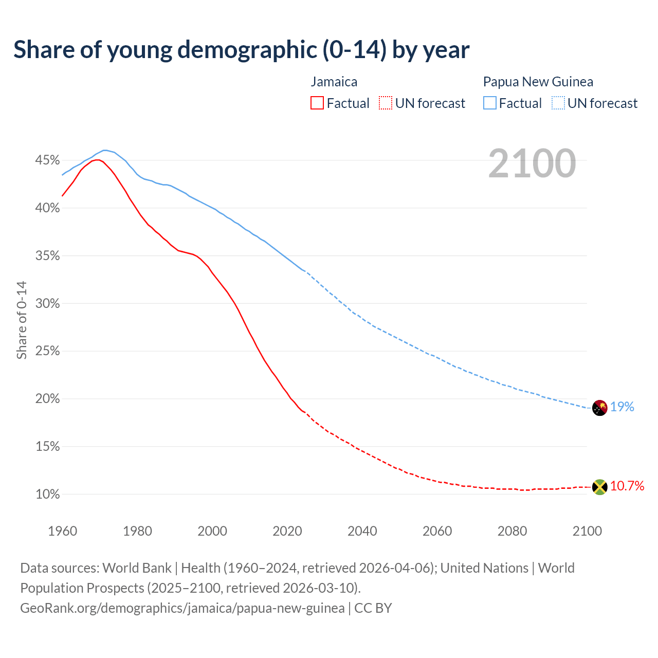 - The share of young demographic (0-15 years old) in Jamaica is 18.7% vs 33.5% in Papua New Guinea.