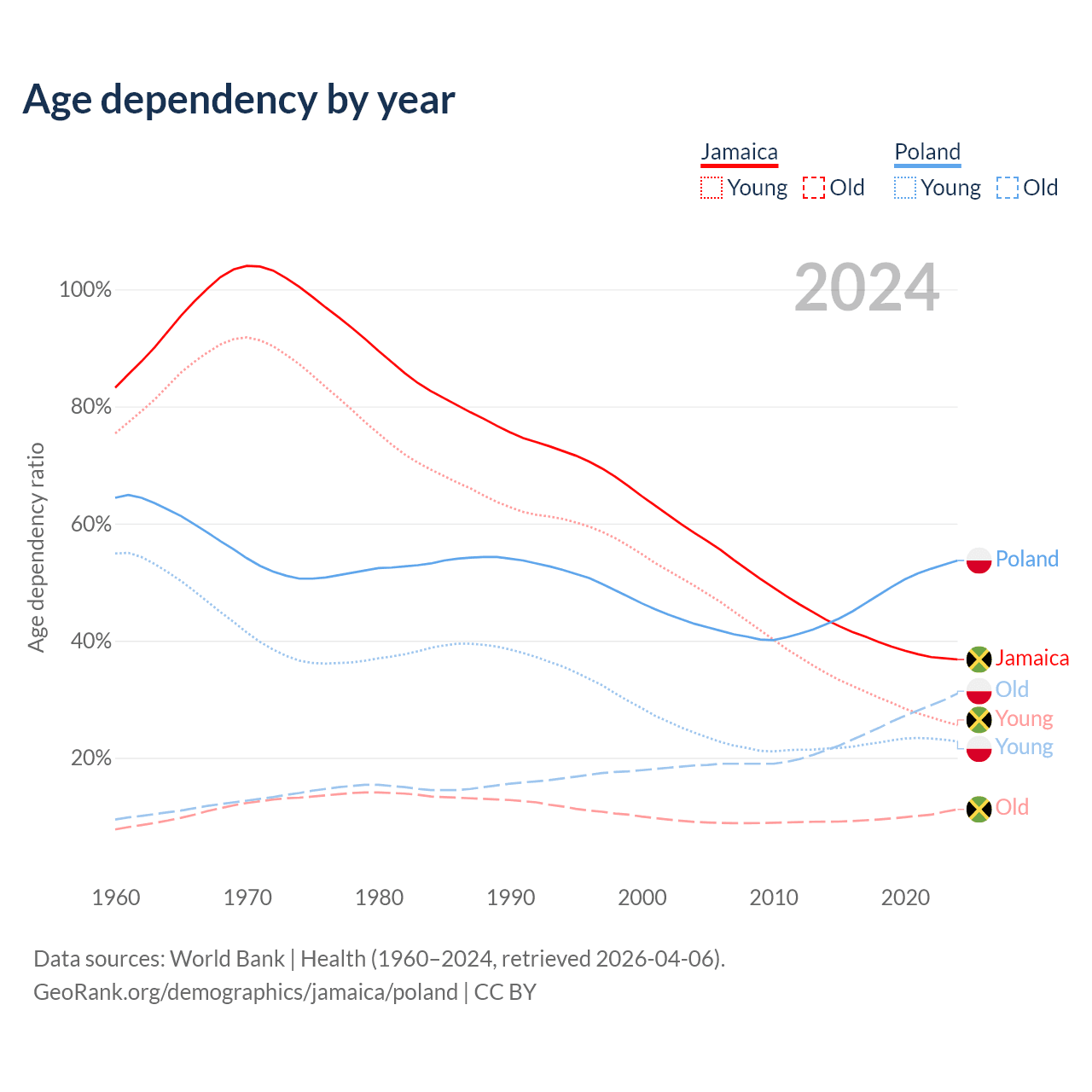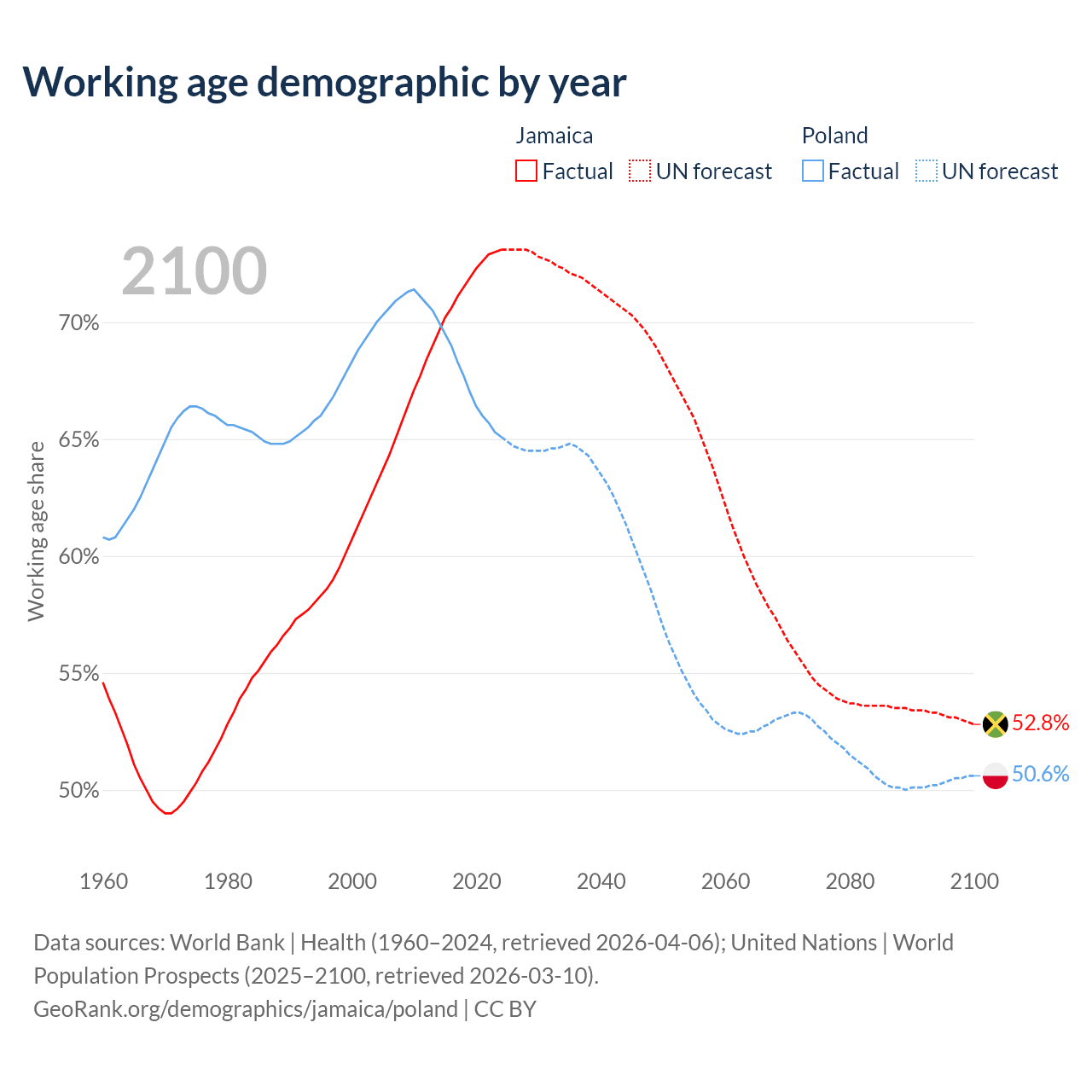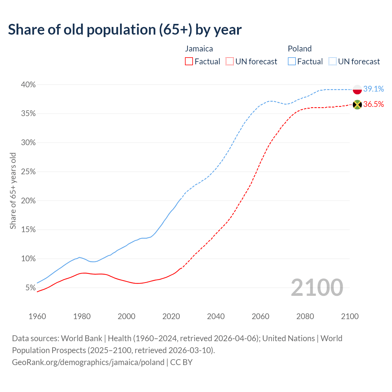 The share of older people aged 65 and over is 8.21% in Jamaica and 20.1% in Poland. Life expectancy in Jamaica compared to Poland .