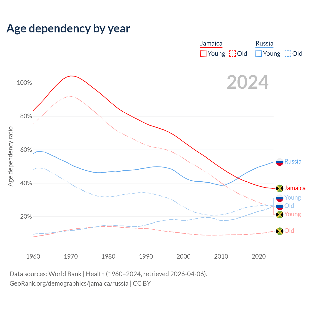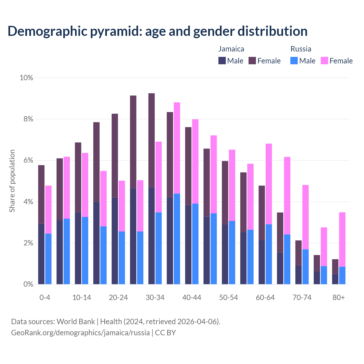 - Jamaica is ranked 87/196 by median age (oldest to youngest) vs 42/196 for Russia.