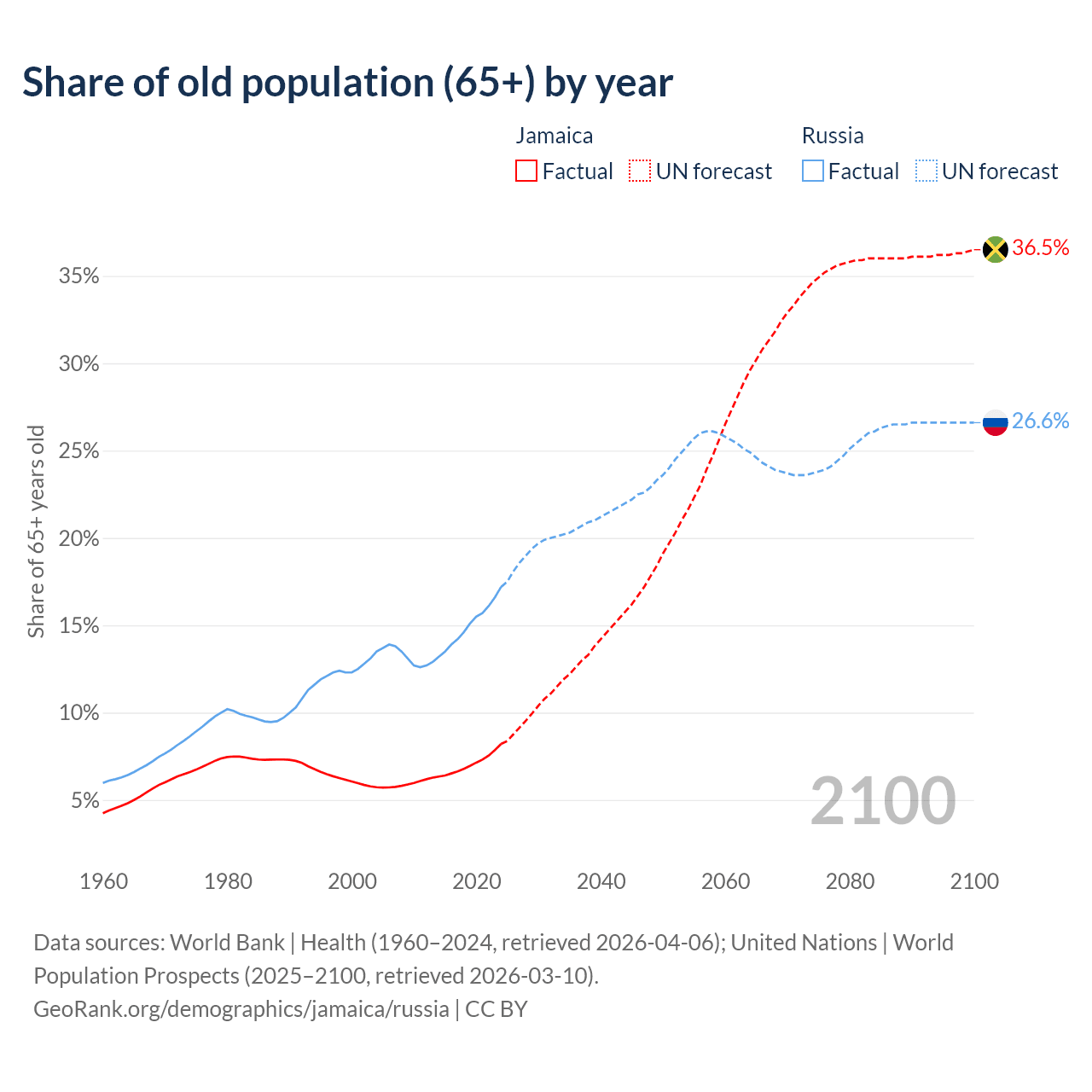 The share of older people aged 65 and over is 8.21% in Jamaica and 17.2% in Russia. Life expectancy in Jamaica compared to Russia .