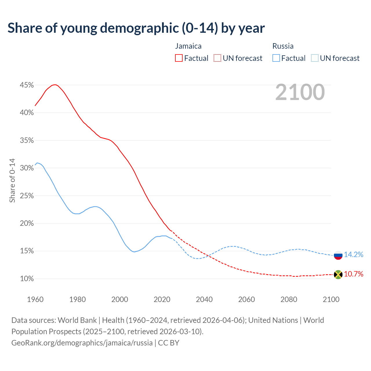 - The share of young demographic (0-15 years old) in Jamaica is 18.7% vs 17.3% in Russia.