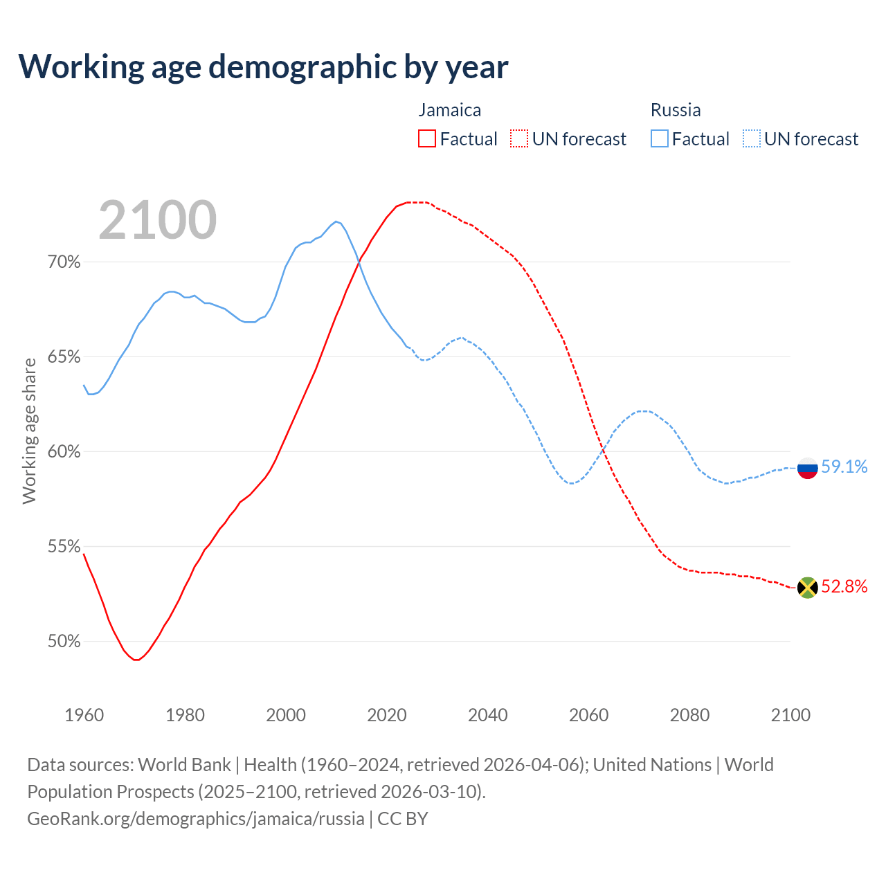 - Jamaica has 2.07M working age adults (aged 15-64) vs 93M in Russia.
