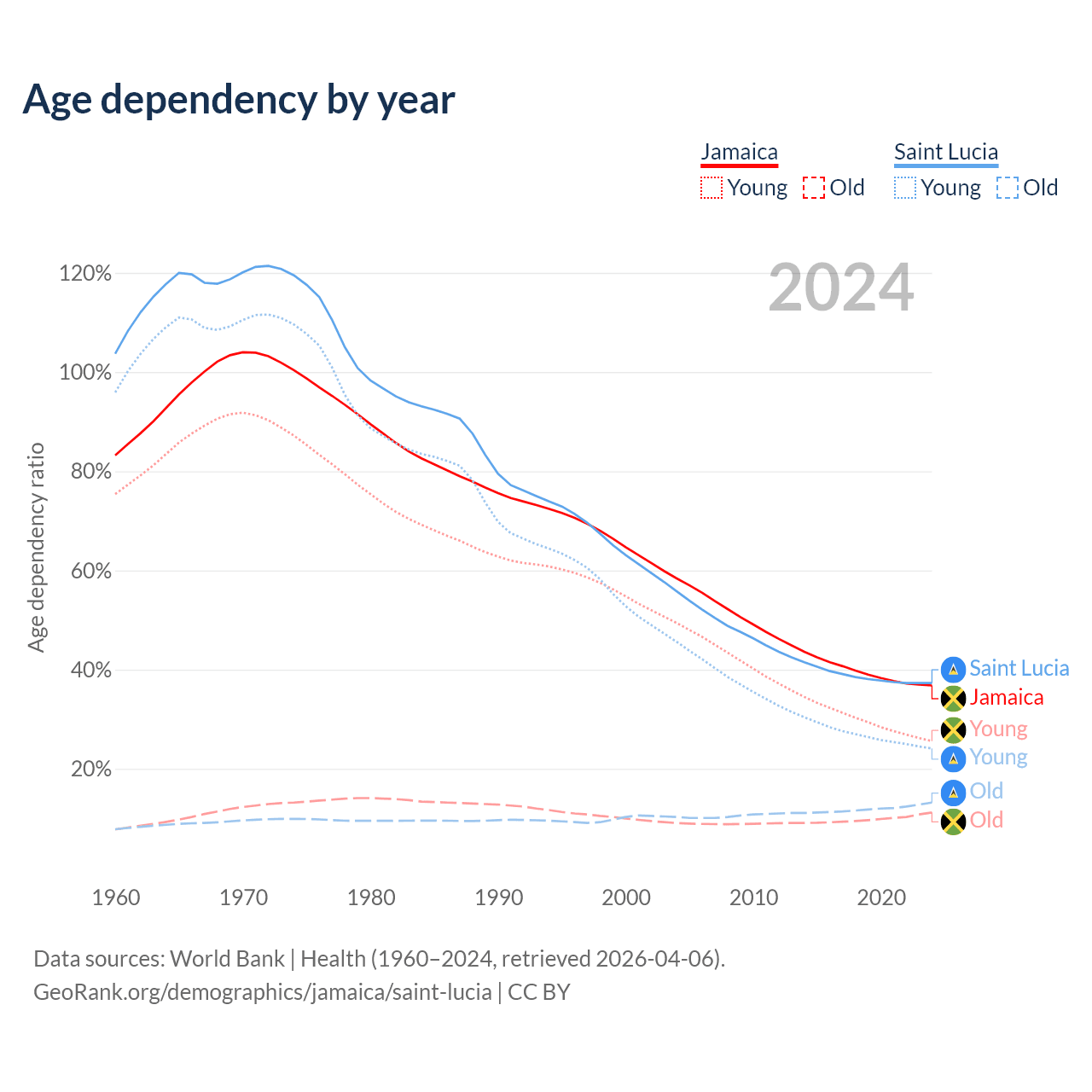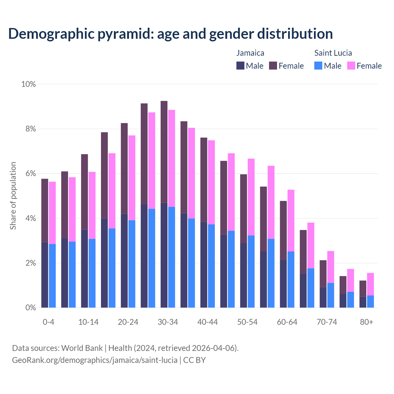 - Jamaica is ranked 87/196 by median age (oldest to youngest) vs 74/196 for Saint Lucia.
