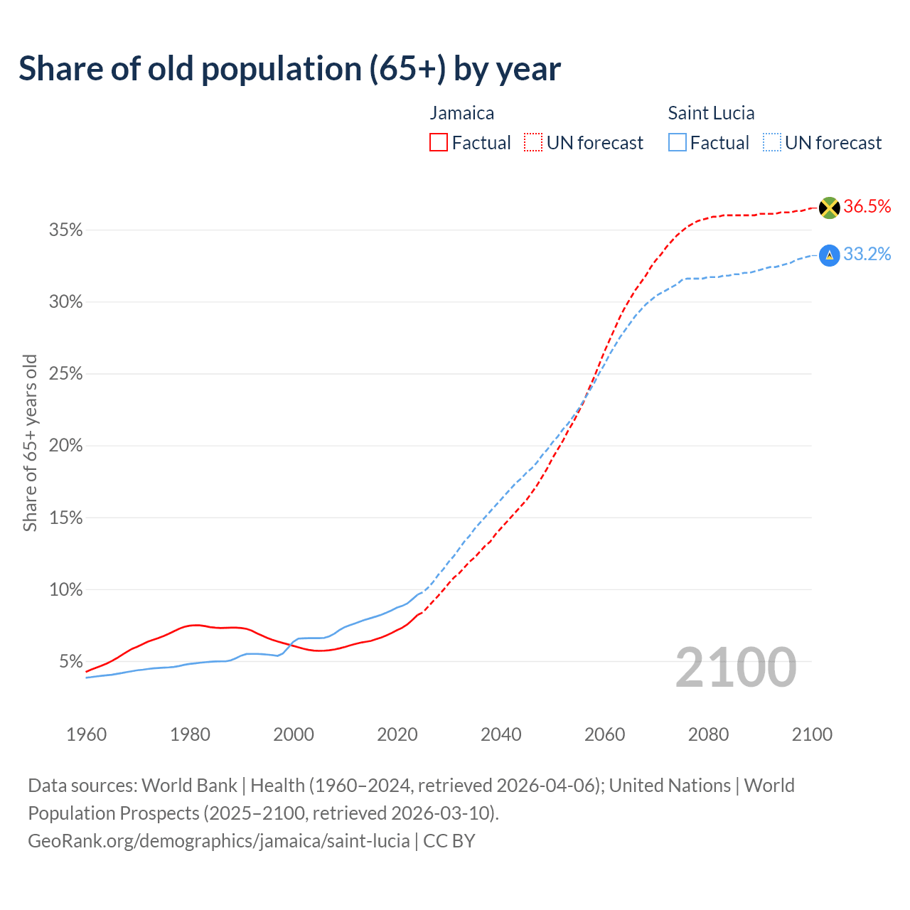 The share of older people aged 65 and over is 8.21% in Jamaica and 9.62% in Saint Lucia. Life expectancy in Jamaica compared to Saint Lucia .