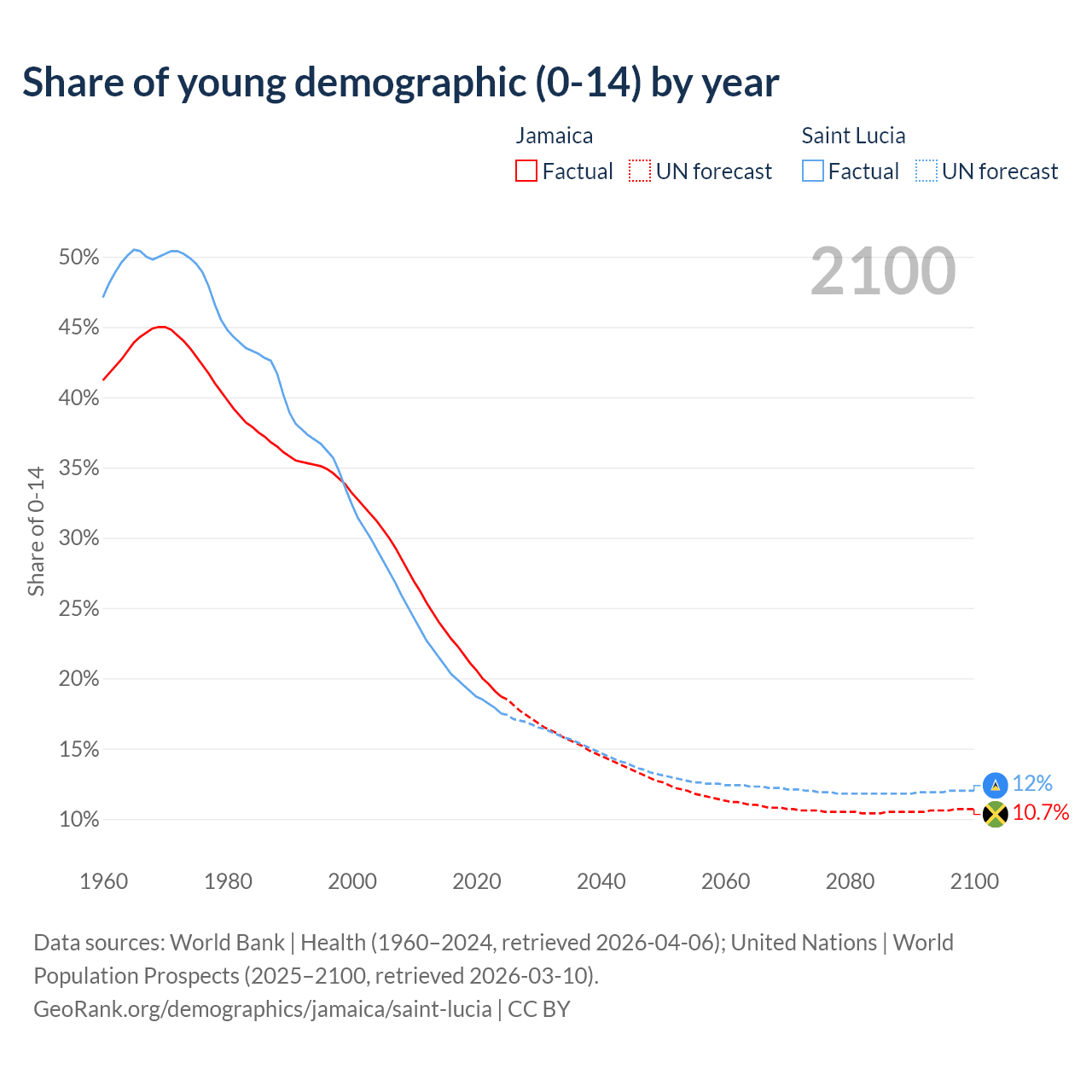 - The share of young demographic (0-15 years old) in Jamaica is 18.7% vs 17.5% in Saint Lucia.