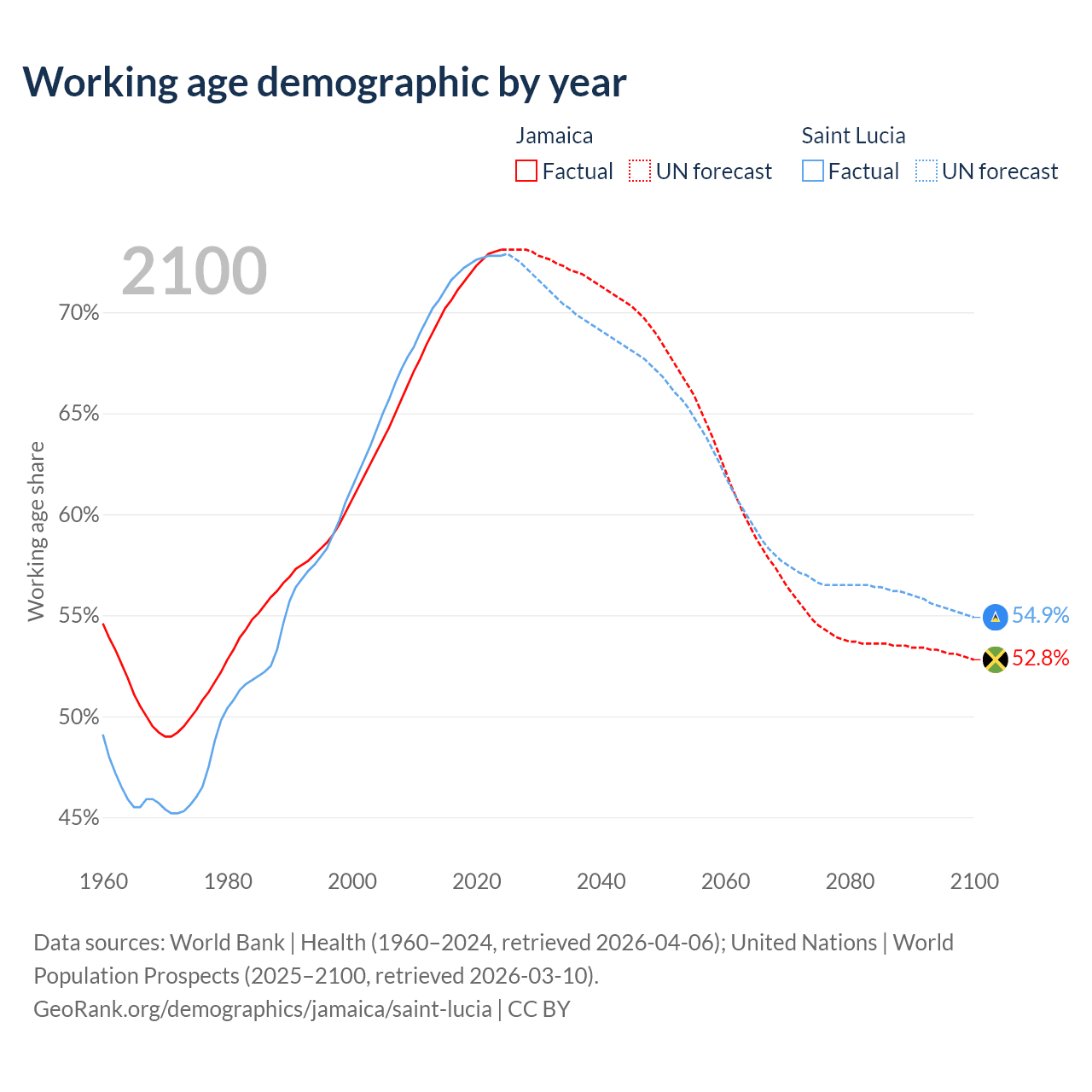 - Jamaica has 2.07M working age adults (aged 15-64) vs 132K in Saint Lucia.