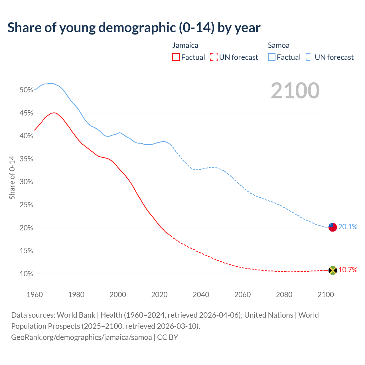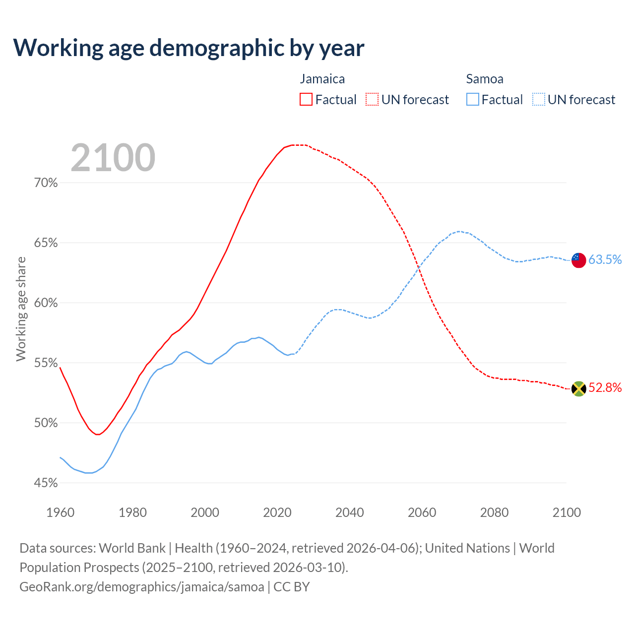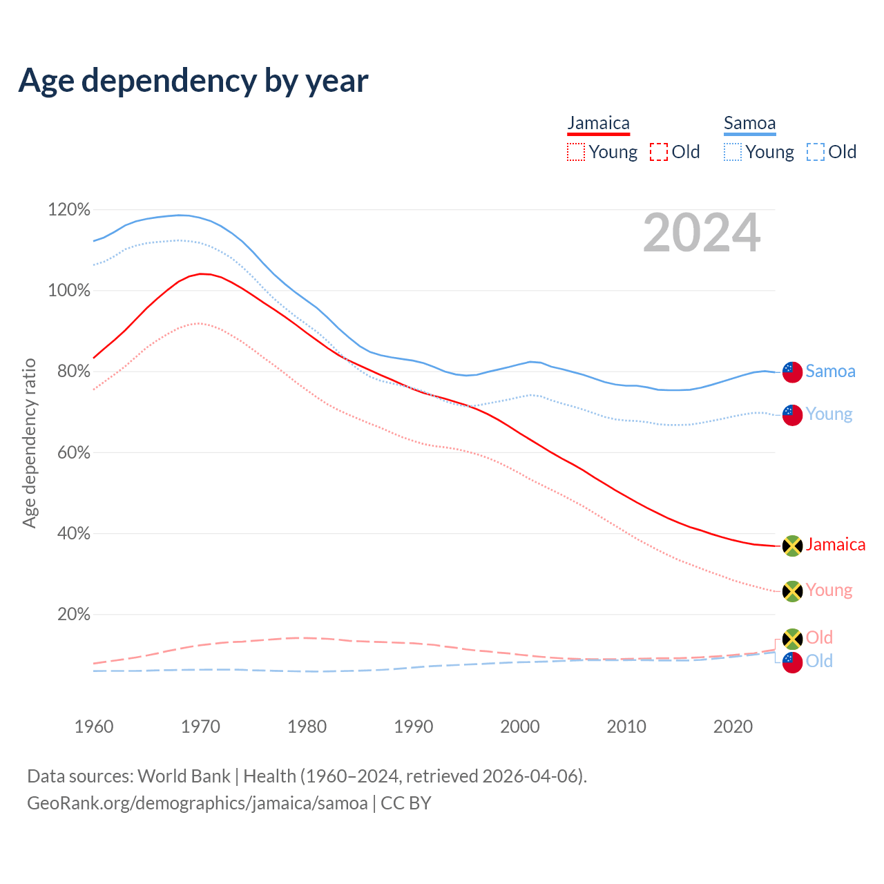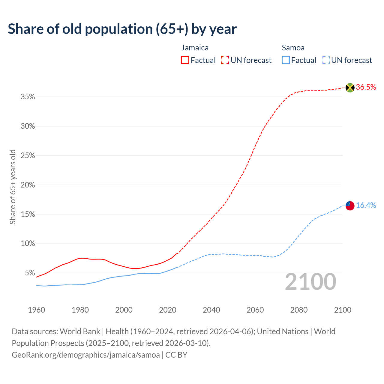 - The share of old-age demographic (65+) in Jamaica is 8.21% vs 5.88% in Samoa.