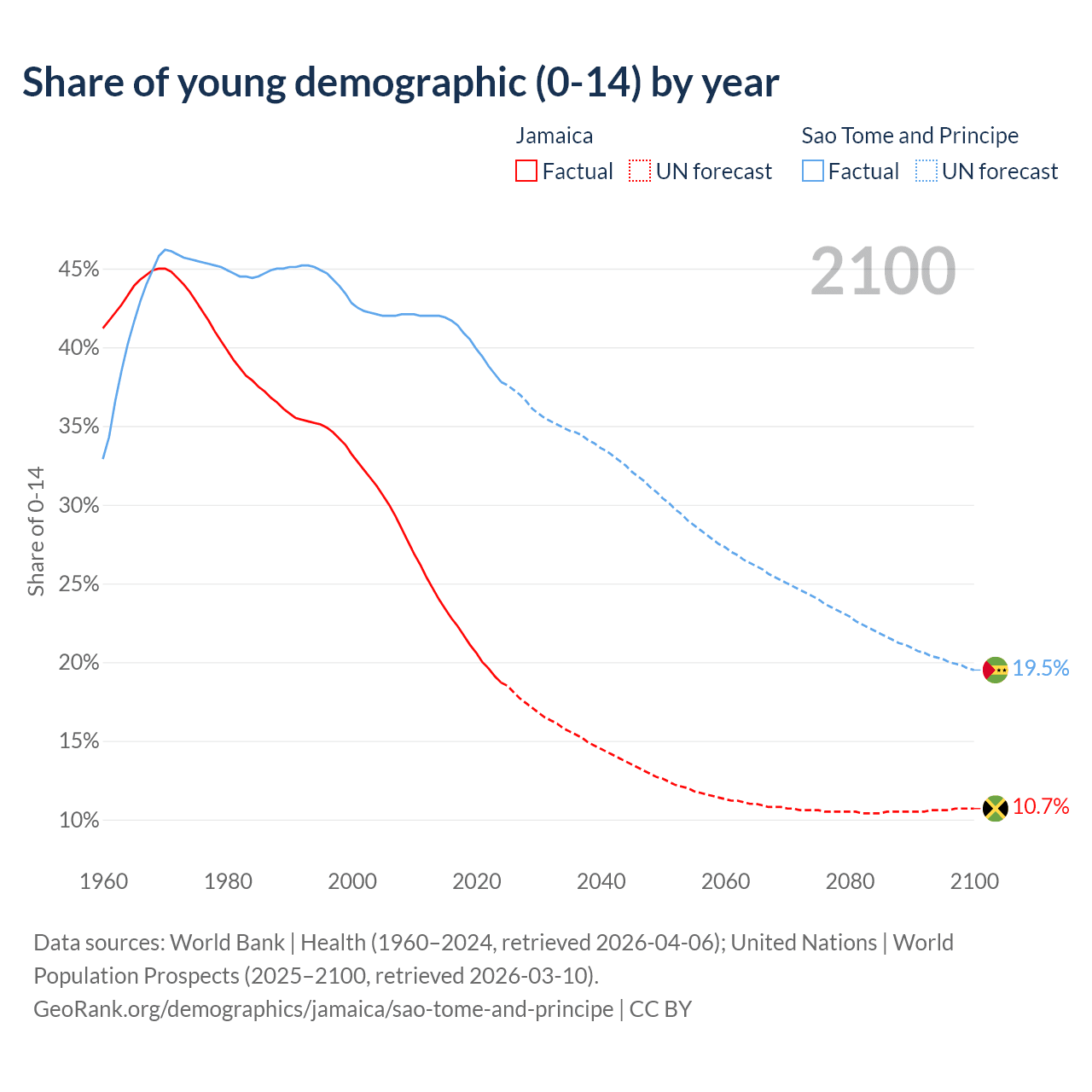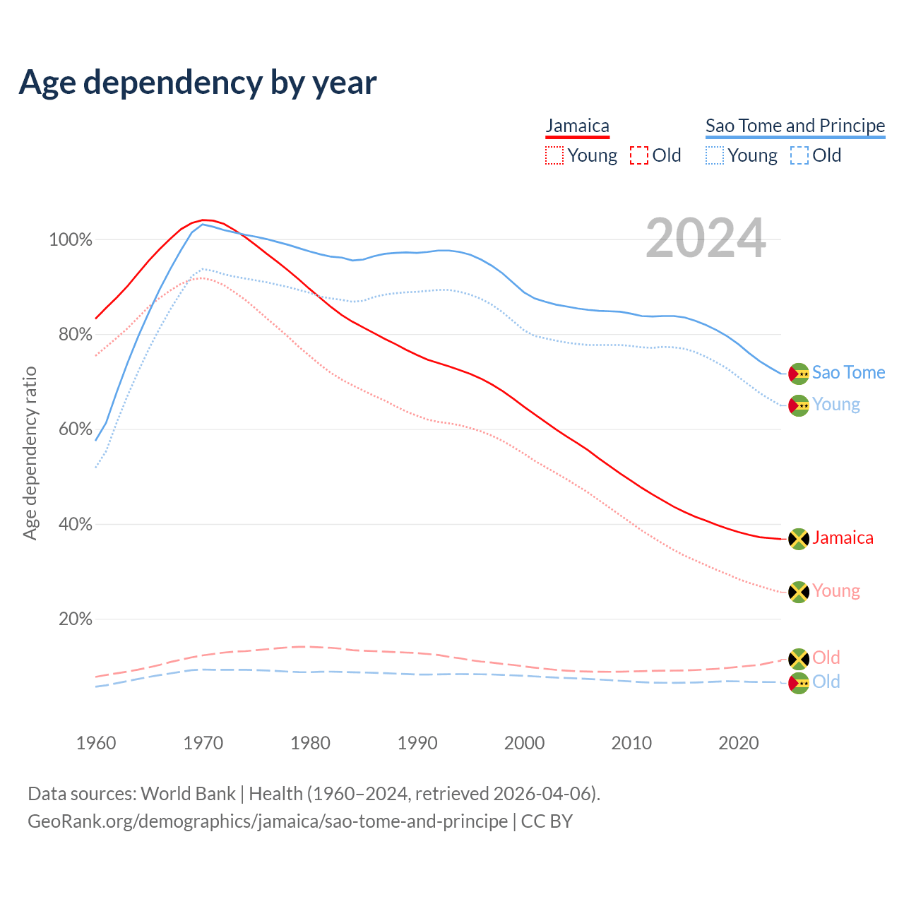 - Jamaica is ranked 87/196 by median age (oldest to youngest) vs 163/196 for Sao Tome and Principe.