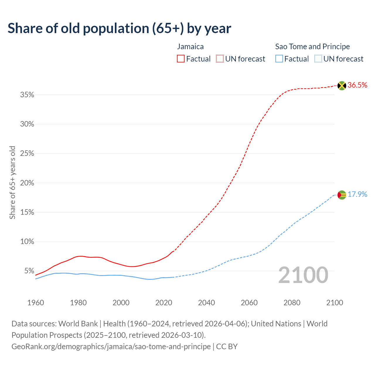 The share of older people aged 65 and over is 8.21% in Jamaica and 3.9% in Sao Tome and Principe. Life expectancy in Jamaica compared to Sao Tome and Principe .