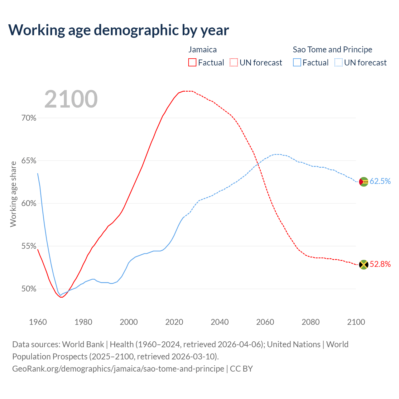 - Jamaica has 2.07M working age adults (aged 15-64) vs 144K in Sao Tome and Principe.