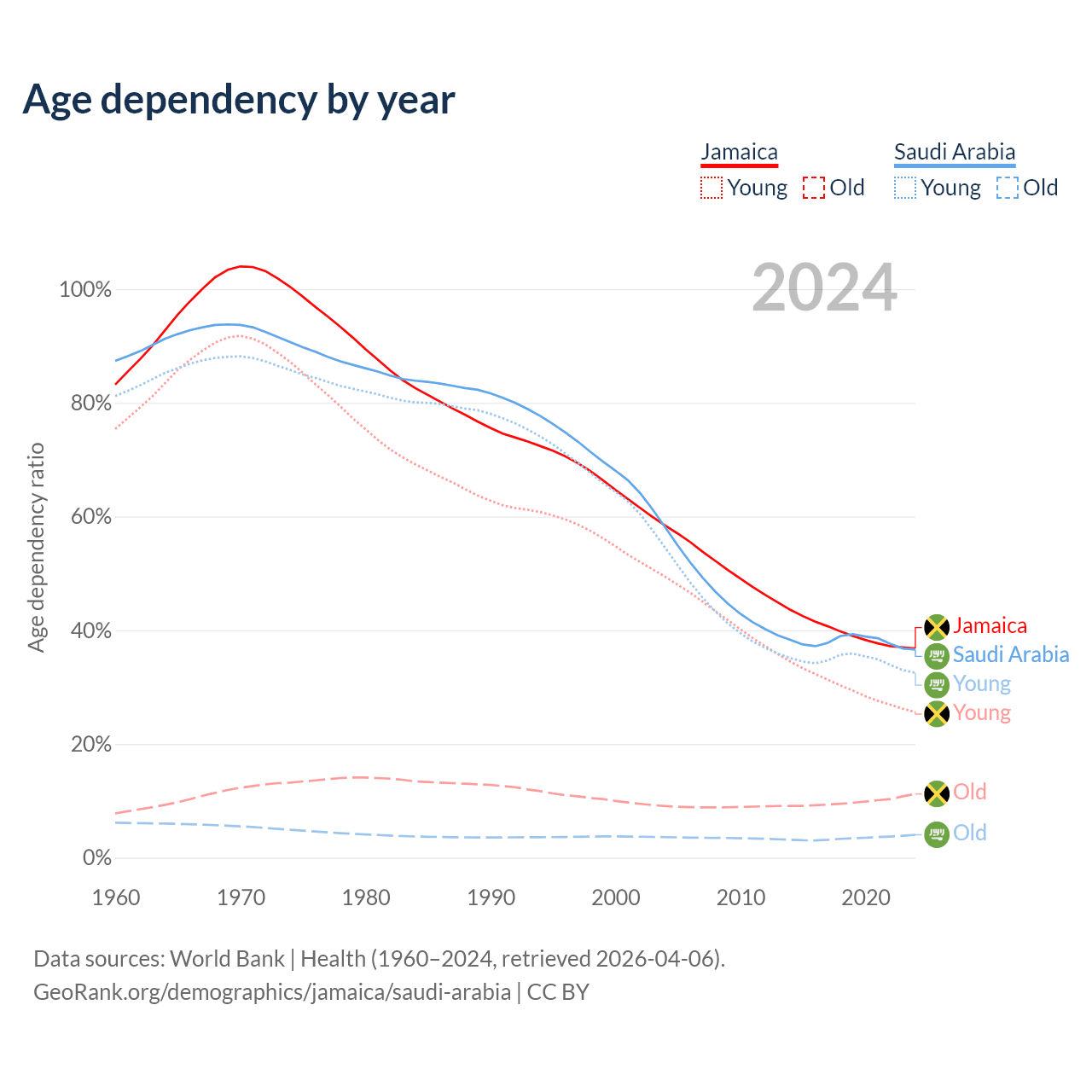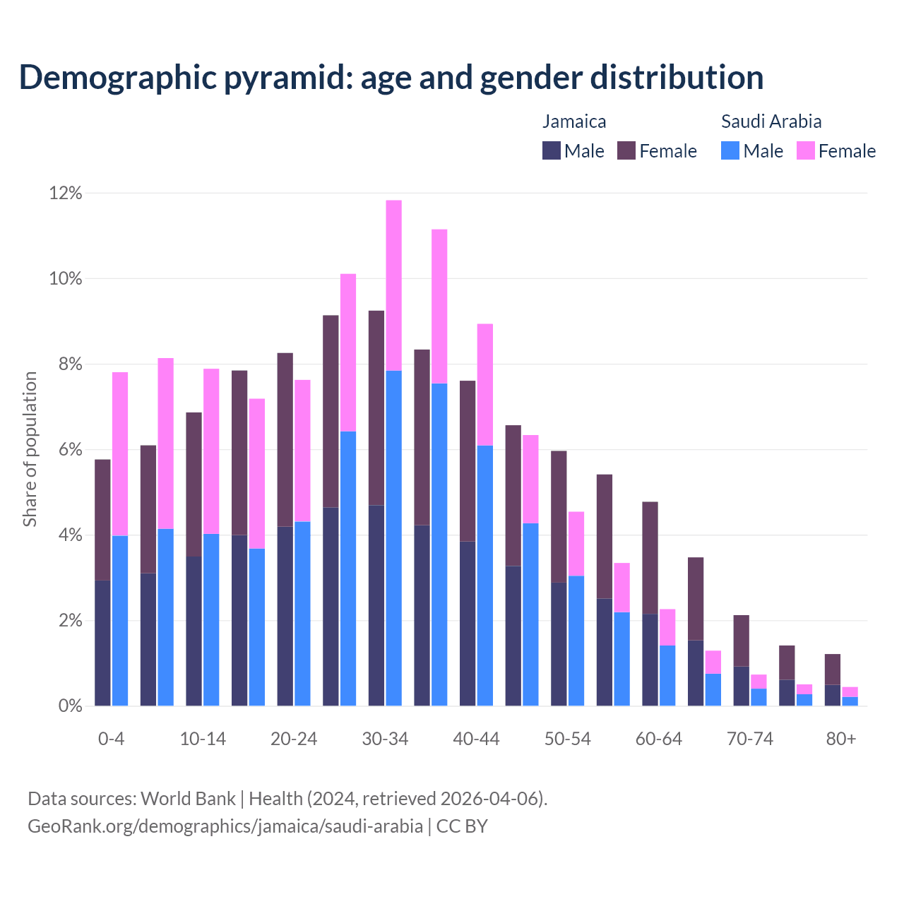- Jamaica is ranked 87/196 by median age (oldest to youngest) vs 98/196 for Saudi Arabia.