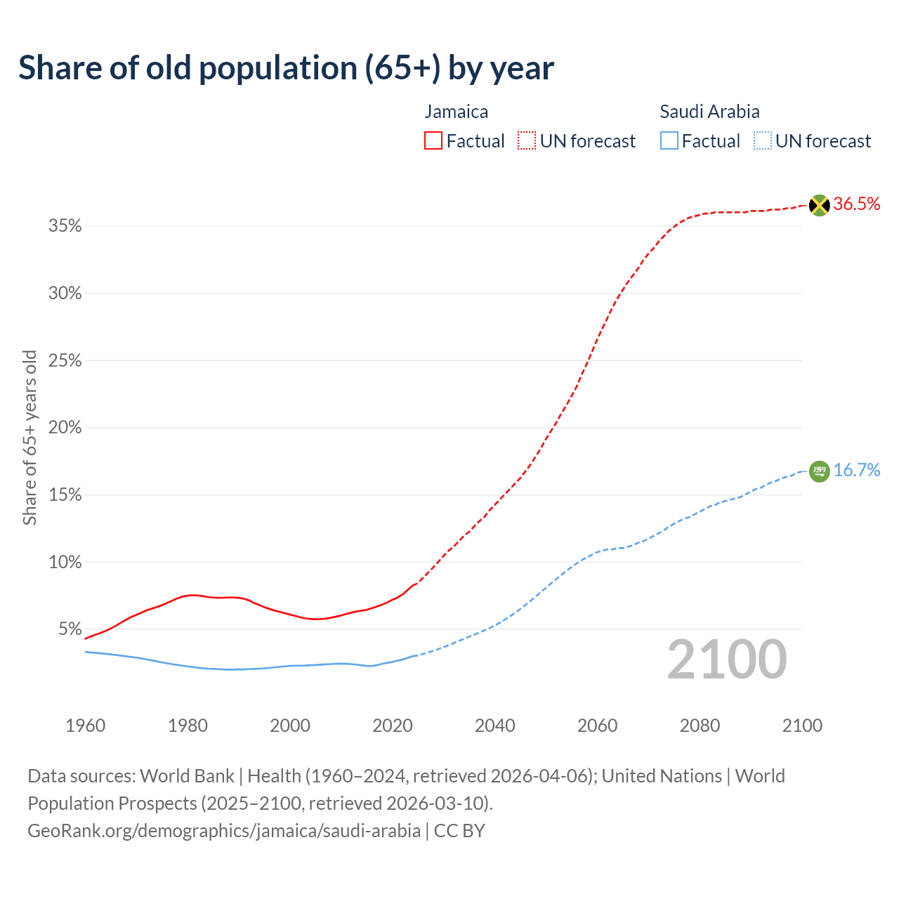 The share of older people aged 65 and over is 8.21% in Jamaica and 2.95% in Saudi Arabia. Life expectancy in Jamaica compared to Saudi Arabia .