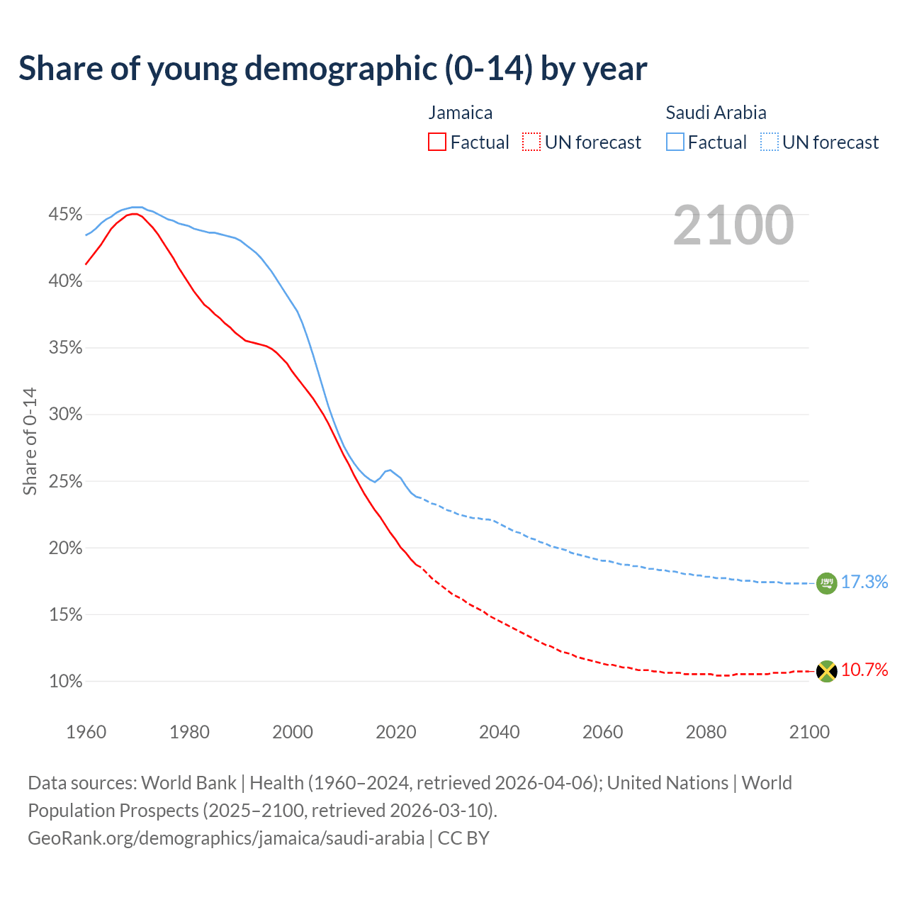 - The share of young demographic (0-15 years old) in Jamaica is 18.7% vs 23.8% in Saudi Arabia.