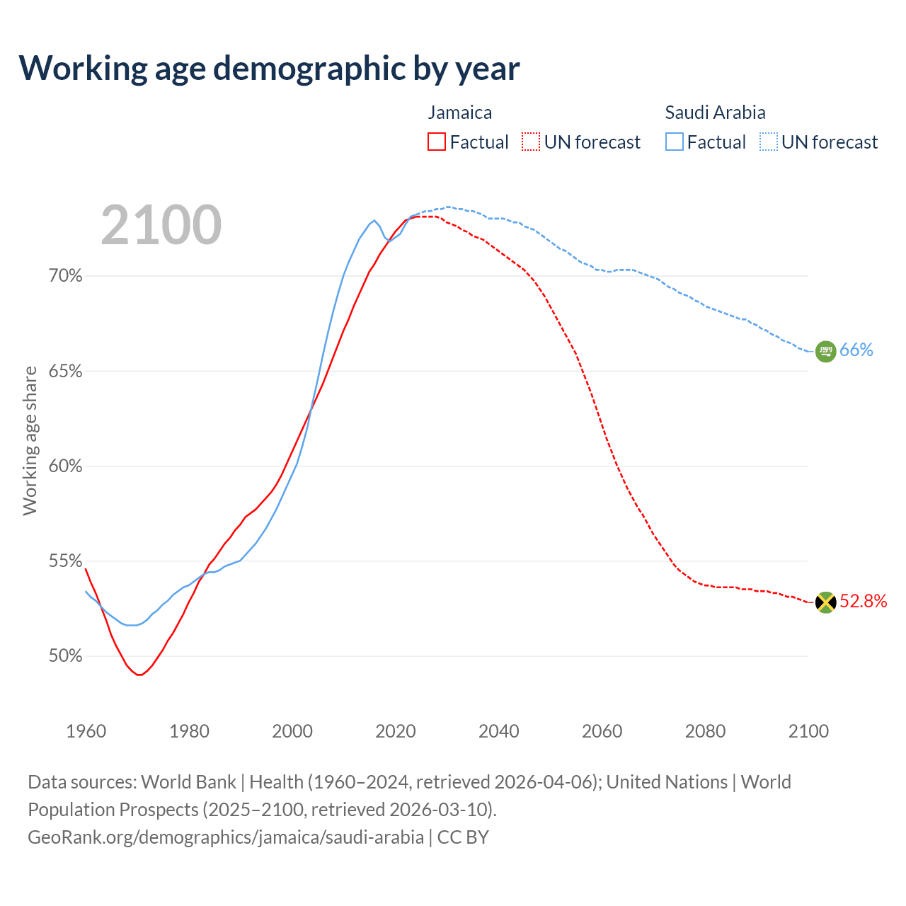 - Jamaica has 2.07M working age adults (aged 15-64) vs 26.9M in Saudi Arabia.